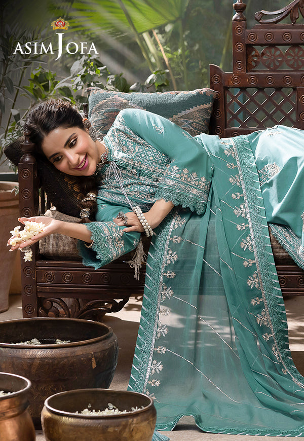 Explore the 'Shadow Work' collection and find your timeless piece of heritage-inspired fashion, the ensemble worn by the captivating Saboor Aly emerges as an embroidered reverie, steeped in the essence of cultural nostalgia. Like a sonnet composed in threads, the luminous embroidery adorns the fabric, weaving a symphony of heritage and craftsmanship. The fabric itself, a canvas of lawn silk and chiffon, becomes an eloquent tapestry that resonates with the rhythms of tradition and ethnicity, as if capturing whispers from the past.