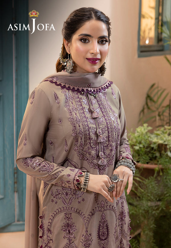 Discover the allure of 'Shadow Work' embroidery reimagined for the modern wardrobe. Our latest collection “Shadow Work” features an exquisite design in metallic grey, harmonizing the richness of purple embroidery with the shimmer of sequins. The motif intricately weaves the essence of damask and ethnic patterns, resulting in an artistic masterpiece. This ensemble comprises an embroidered center panel on lawn silk, paired with matching embroidered side panels and a mesmerizingly detailed back. Elevate your style with ensembles by Asim Jofa that carry the weight of heritage while embracing contemporary grace.