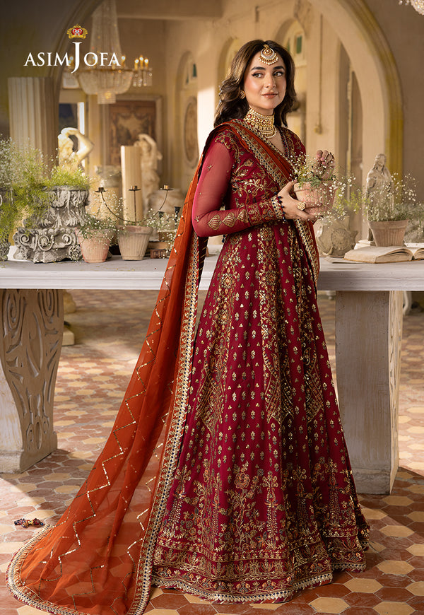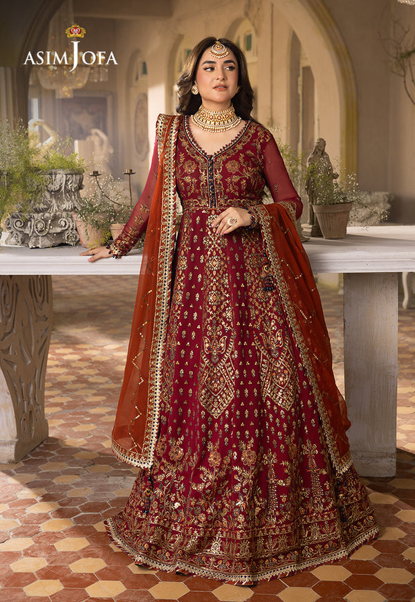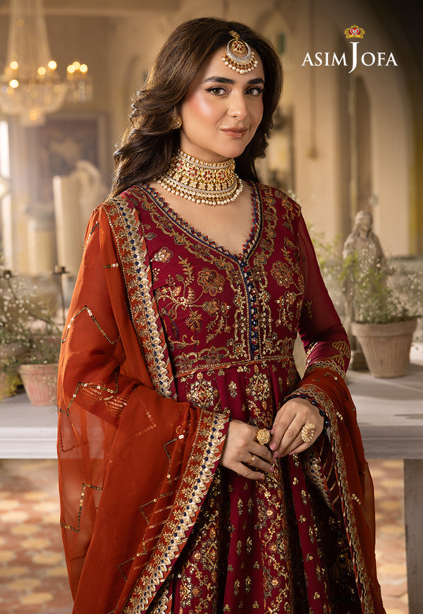 Experience a Rouge Rhapsody in Bloom with this captivating red peshwas, a floral masterpiece from "Khwab-E-Naubahar." Antique gold zari, maroon, navy blue, and rust threadwork adorned with 5mm sequins and 3mm spangles blossom across the bodice creating a rhapsody of Indian blooms. The embroidered kalis are a garden in full bloom and the ghera's embroidered border is a celebration of nature's grandeur. As you drape the rust-hued dupatta, adorned with four side borders, you become the queen of a poetic rhapsody—a garden of dreams in shades of rouge.