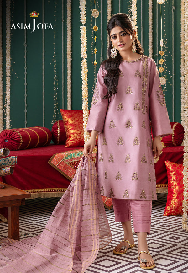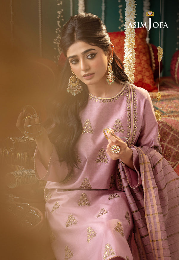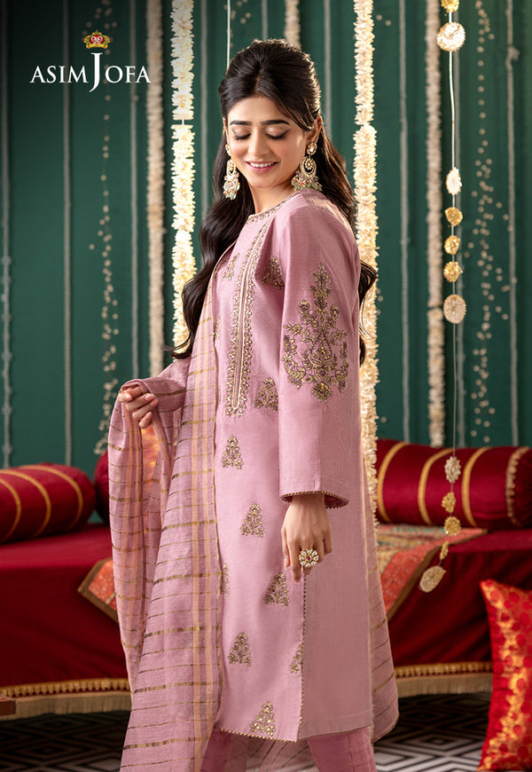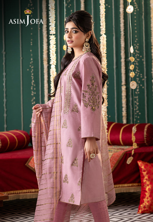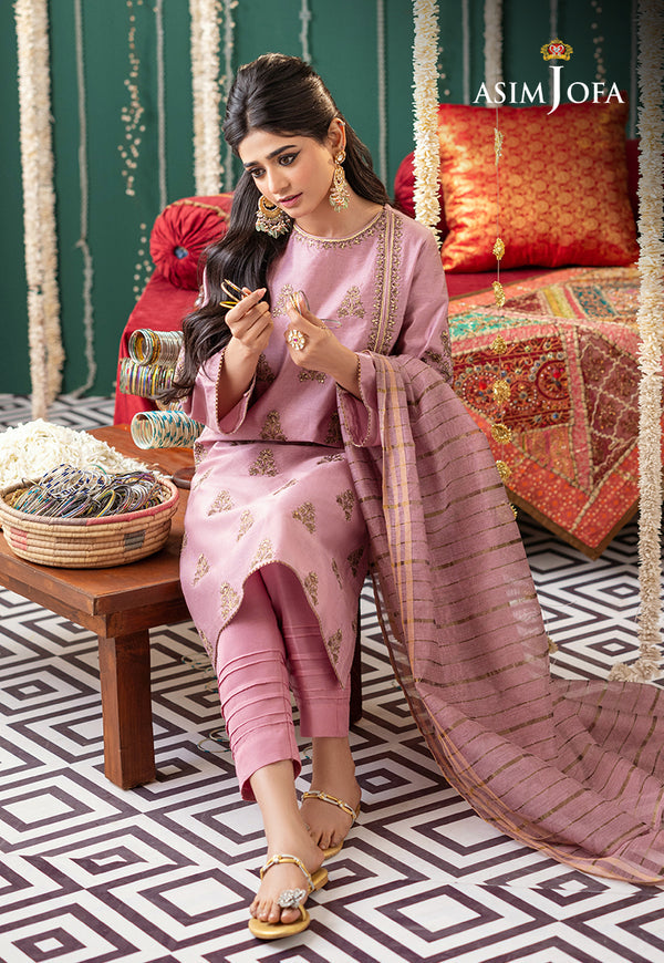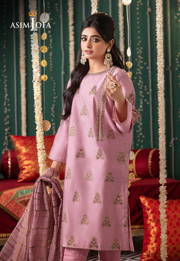 This tea pink 3-piece ensemble features repeated gold-embroidered dupatta, paired with a striped trouser and matching shirt border.