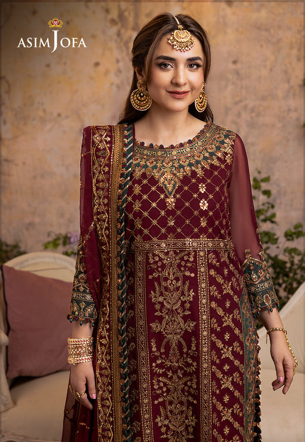 Step into a realm of regal allure with our maroon ensemble, adorned with bottle green borders and neckline—a piece that embodies the essence of royalty. This regal masterpiece, embellished with 5mm and 3mm antique gold sequins, golden zari, dull gold, and maroon thread, is a tapestry of opulence. The embroidered neckline is a regal proclamation that invites you into a world of exquisite elegance. The bodice is adorned with a thin border and the center and side panels create an ensemble of timeless sophistication. The daman with borders on bottle green adds a touch of grandeur. Sequins adorn the sleeves and bunches grace the sleeves hem on bottle green. The lace for chaak and border for trouser hem on bottle green are touches of finesse. Paired with an embroidered dupatta with borders this ensemble is the epitome of regal splendor.