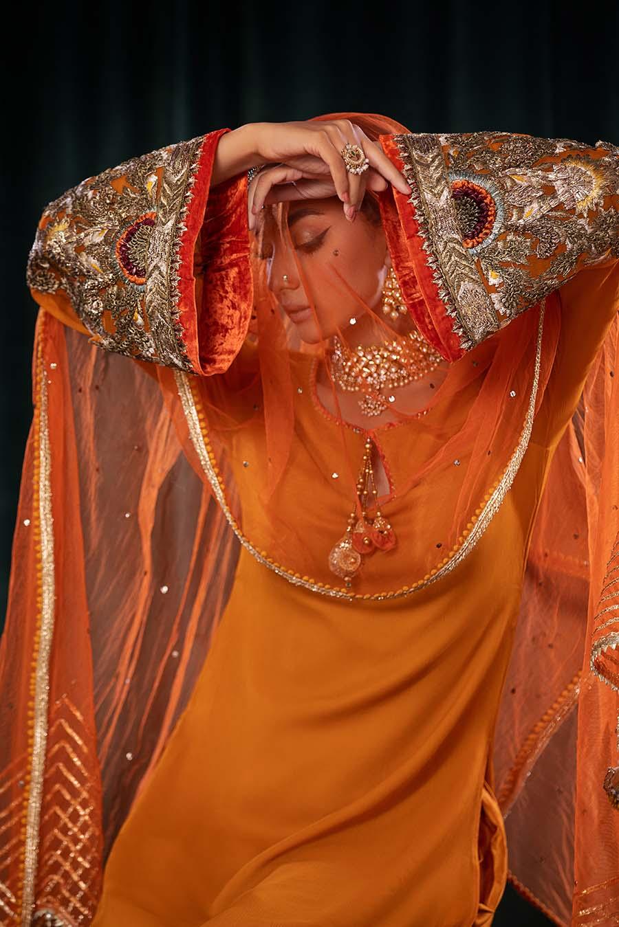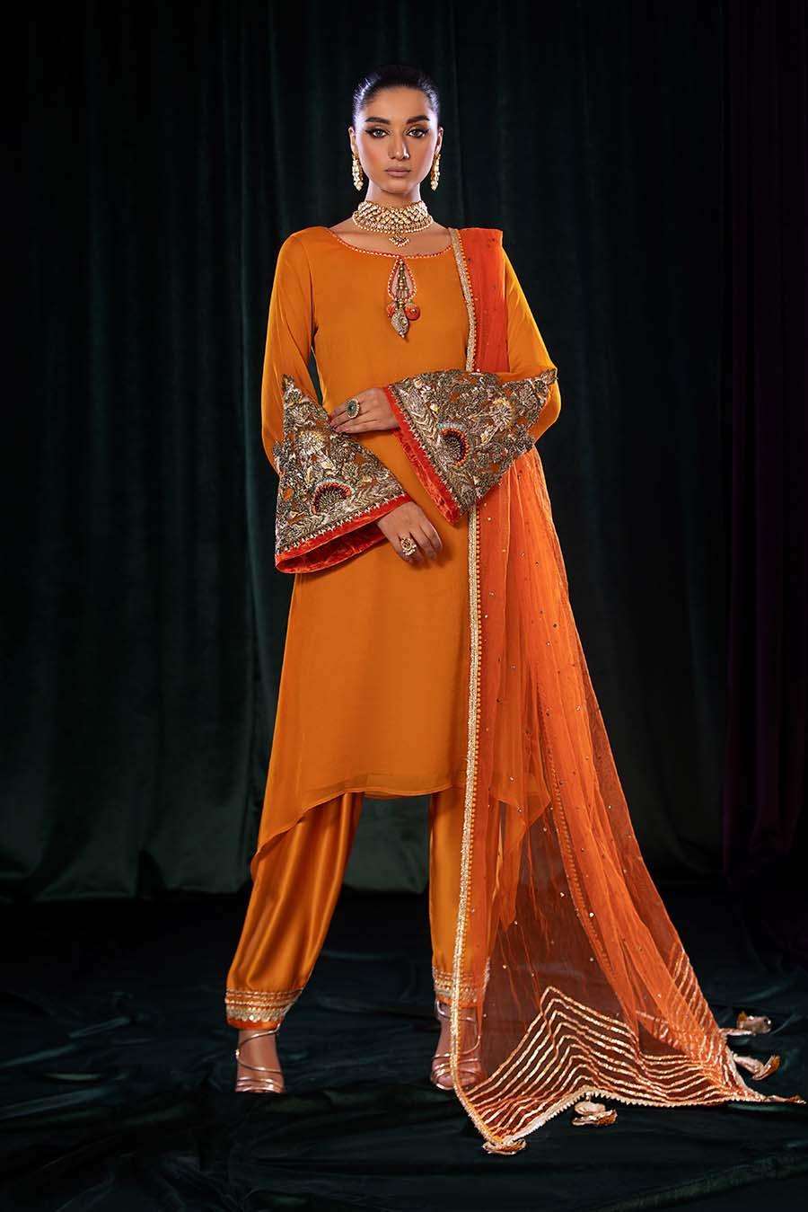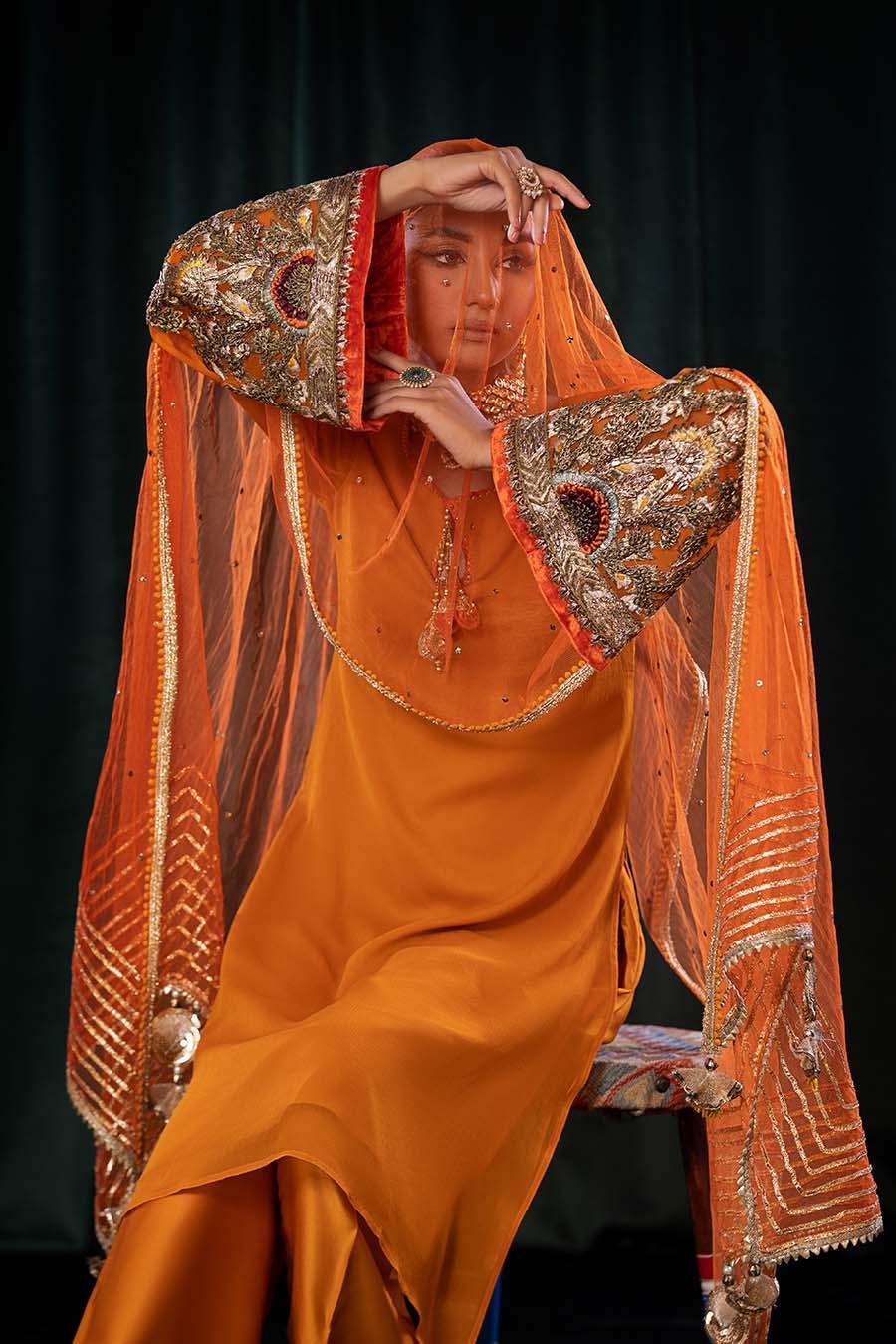 "Step into timeless elegance with our Crinkle Chiffon shirt, featuring sleeves in the same fabric adorned with Kora, Dabka, Tilla, and Gotta work. Enhance your look with the luxurious touch of Silk trousers, creating a sophisticated and stylish ensemble that captivates with every detail.""