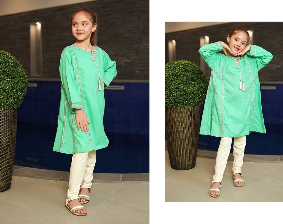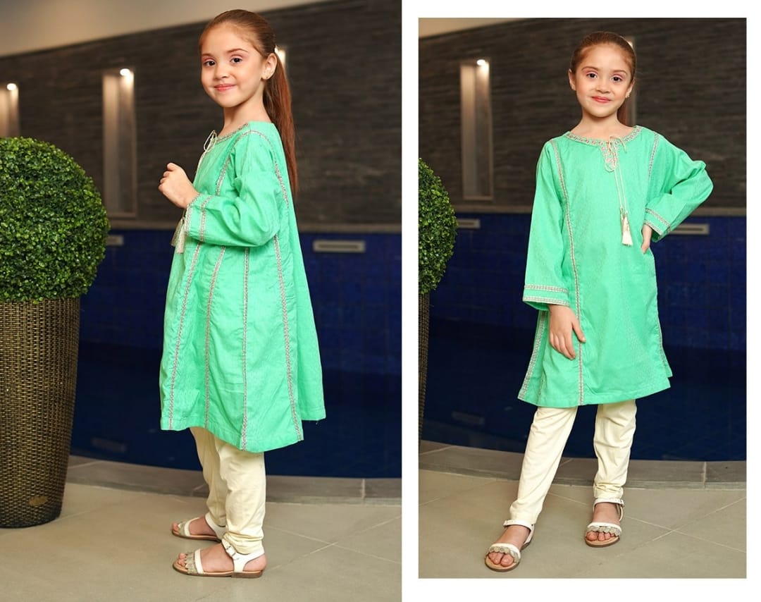A delightful addition to your little one's Eastern wear collection. This stitched kurta-style Kurti features enchanting panels adorned with intricate embroidery, adding a touch of elegance and charm. It's refreshing green hue captures the essence of spring, making it perfect for festive occasions and special gatherings.