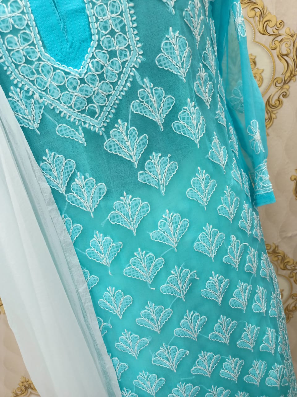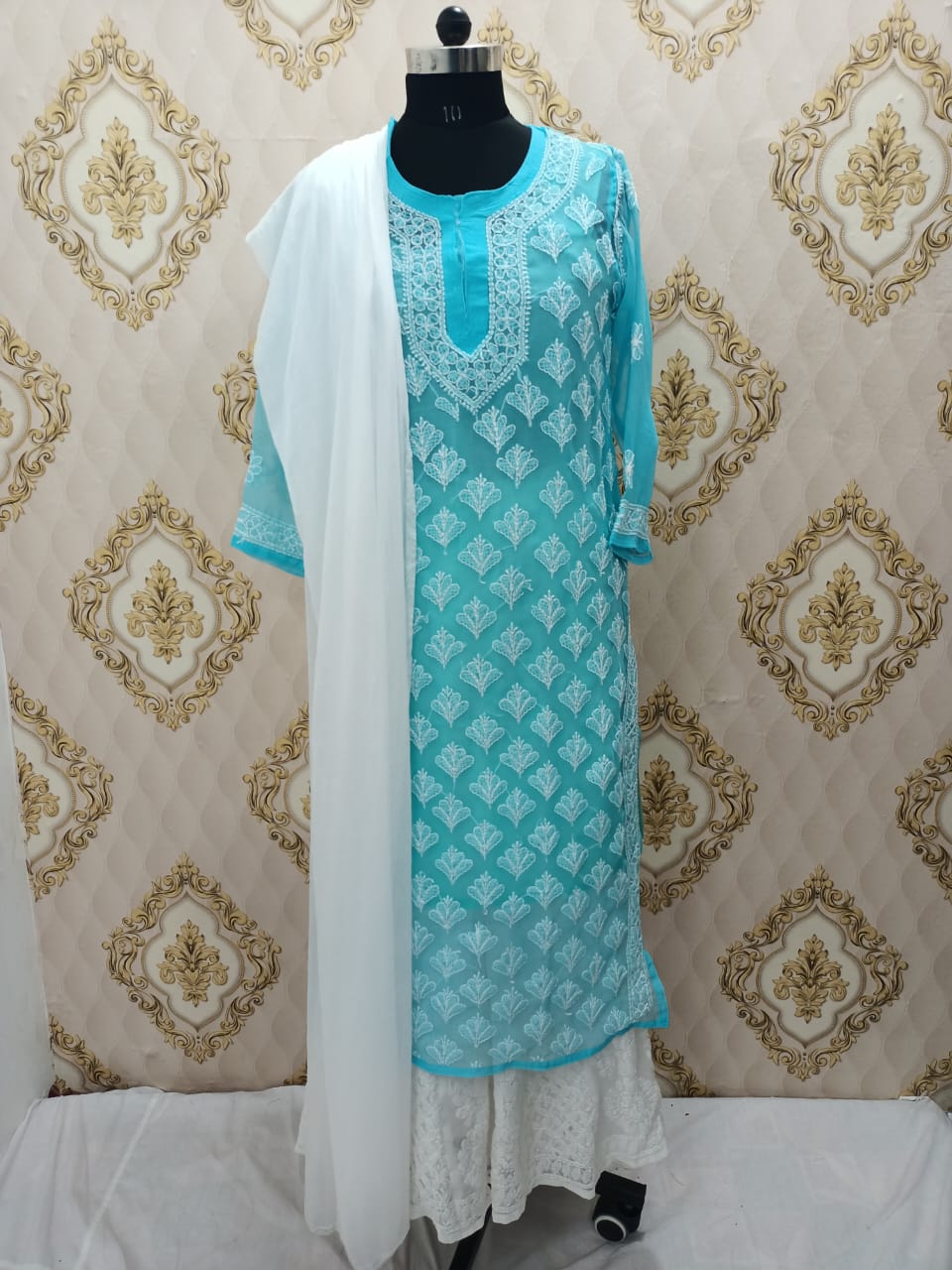 Step into timeless elegance with the Olive Atelier Lucknowi Chikankari Booti Jaal Ensemble. This exquisite set includes a beautifully crafted kurti, sharara, dupatta, and inner, all adorned with intricate Lucknowi chikankari work. The delicate booti jaal patterns enhance the traditional charm, making it a perfect choice for festive occasions and cultural celebrations. Made from premium georgette fabric, this ensemble offers a perfect blend of comfort and style. Available in a variety of enchanting colors—White, Red, Yellow, Light Purple, Baby Pink, and Blue—this set ensures you can choose the perfect hue to suit any event. The flowing Sharara and matching dupatta add a touch of grace, while the inner ensures a seamless and comfortable fit. Embrace the rich heritage of Lucknowi embroidery with this stunning ensemble from Olive Atelier.