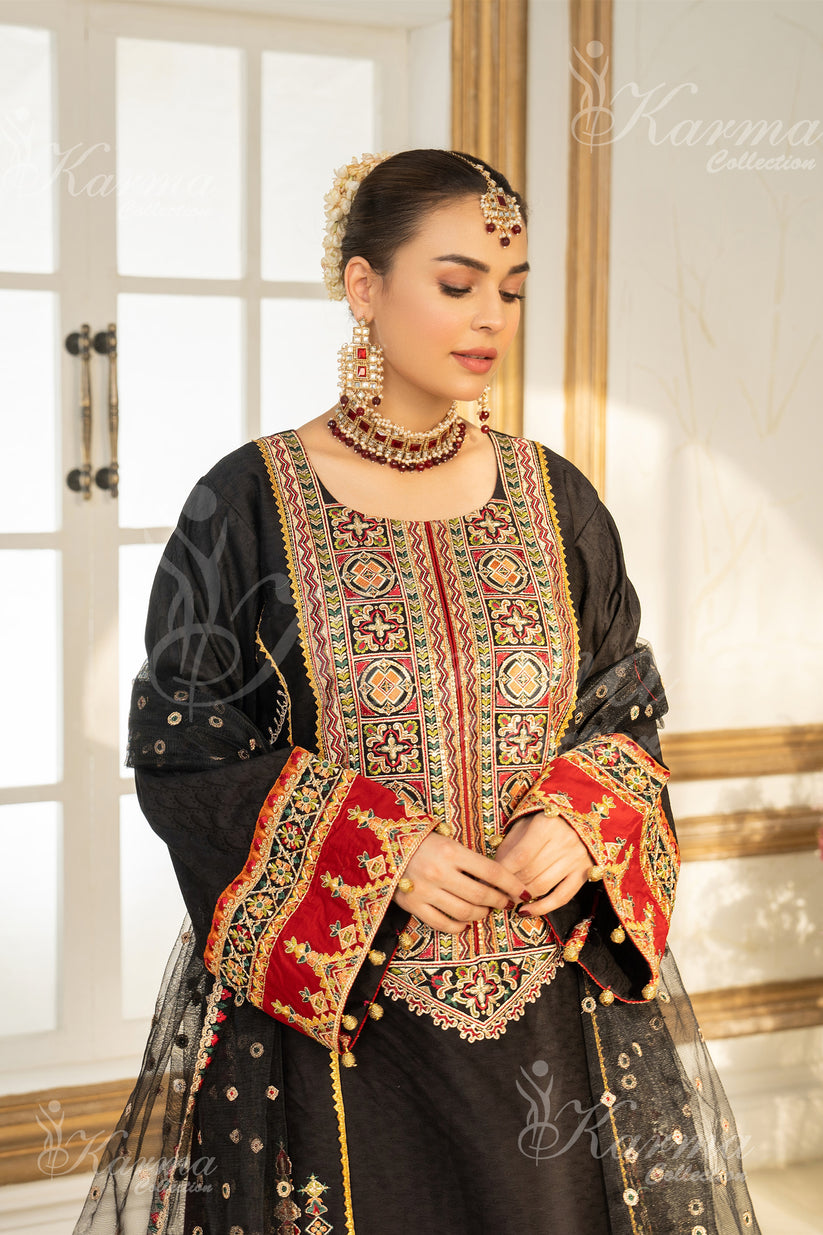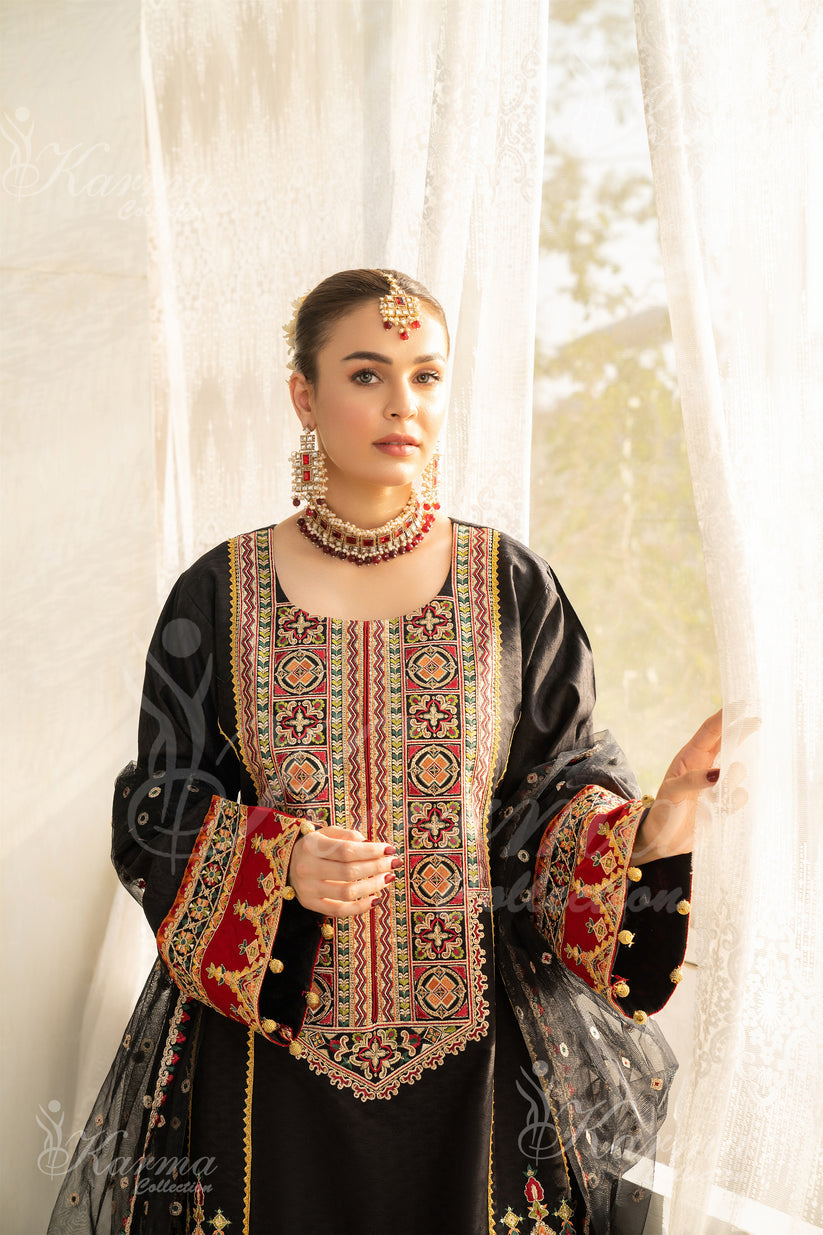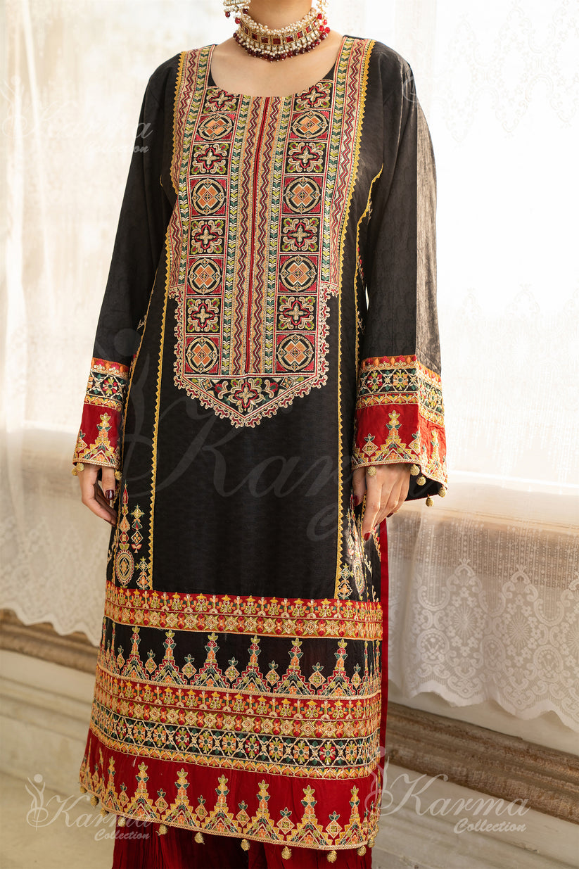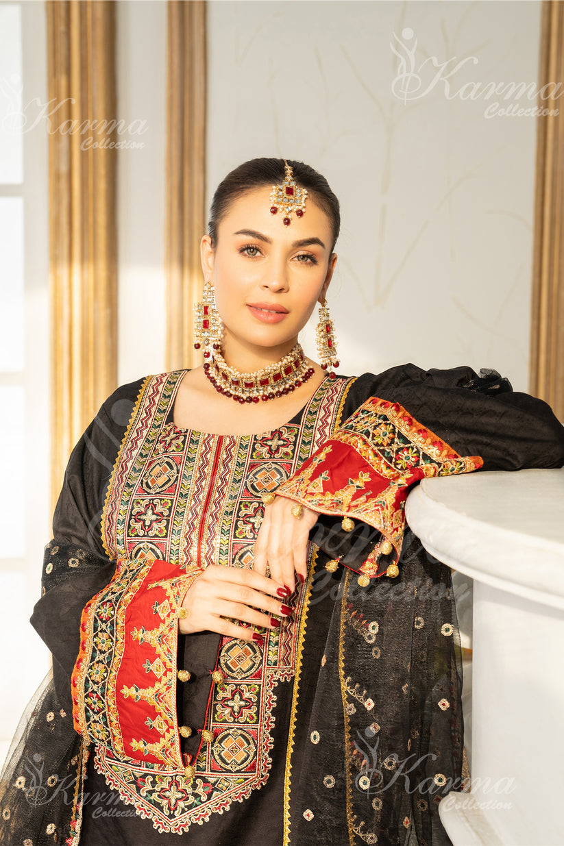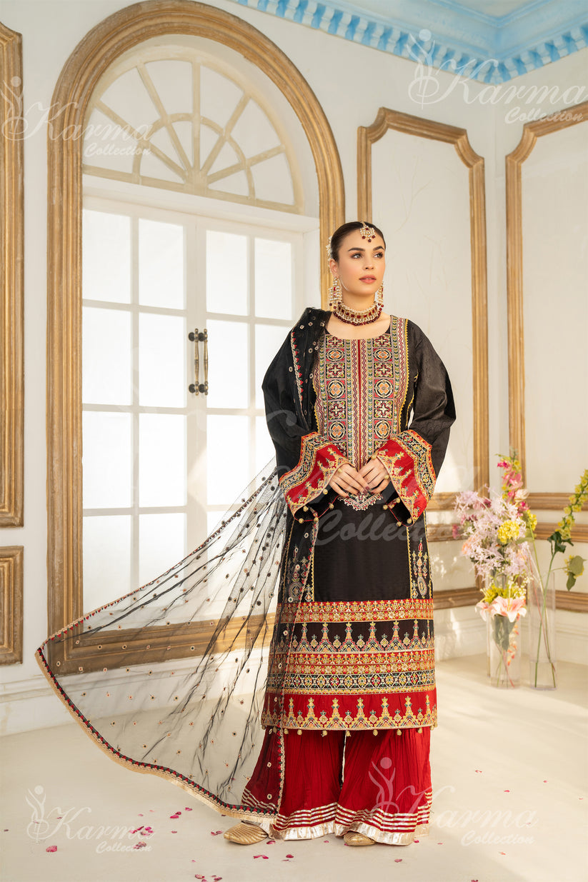 Elegant 3-Piece Suit Collection in rich cocoa brown, adorned with opulent gold and striking red accents. This formal ensemble exudes sophistication and class, perfect for special occasions. The intricate delicate work adds a touch of finesse, while the accompanying organza dupatta completes the look with grace and charm.
