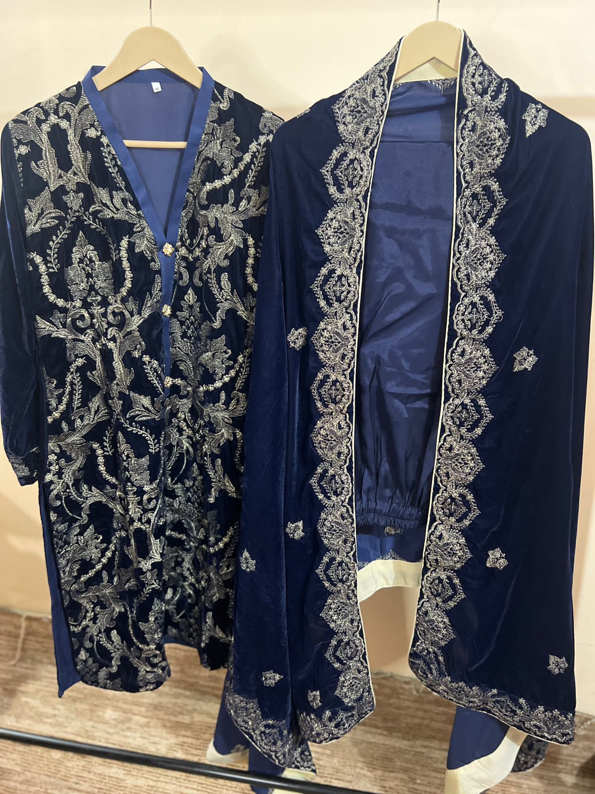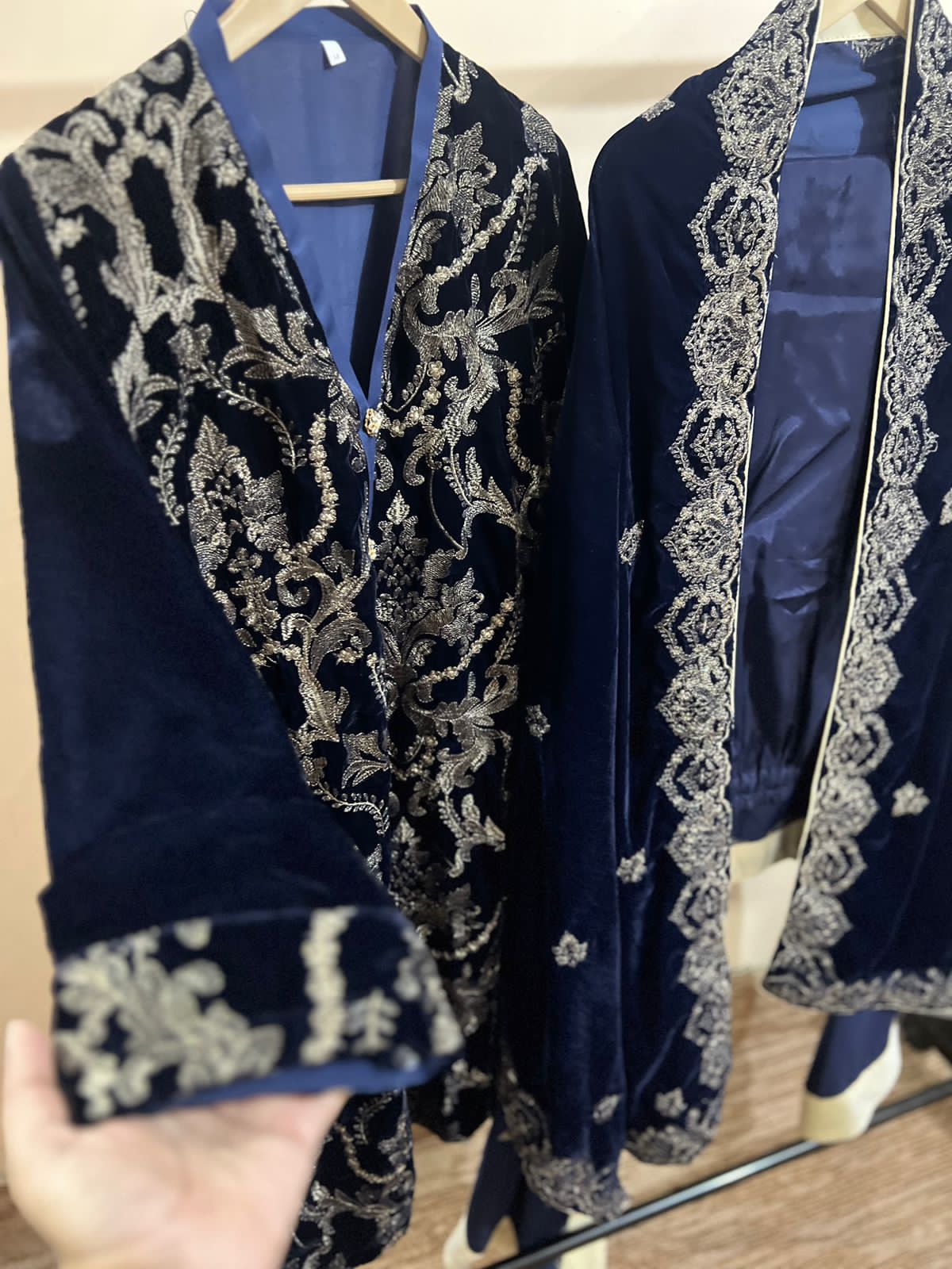 Elegance in Velvet: 3-Piece Dark Blue Velvet Ensemble with Machine Work and Silk Pants