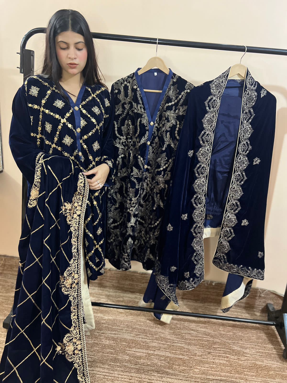 Indulge in opulence with our "Elegance in Velvet" ensemble. This 3-piece masterpiece, featuring a luxurious dark blue velvet fabric adorned with intricate machine work, is designed to make you stand out at any special occasion. The richness of velvet harmonizes with the detailed craftsmanship, creating an ensemble that exudes sophistication.