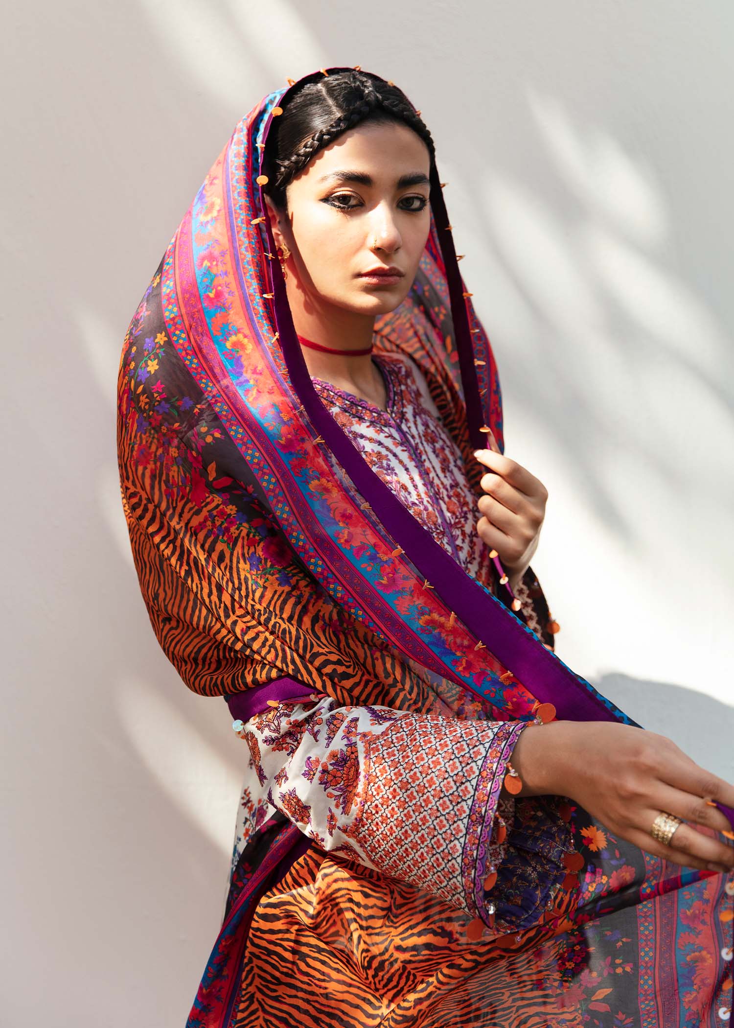 A chic three-piece suit featuring a printed and embroidered shirt, a beautifully colored dupatta, and matching trousers. Elevate your style effortlessly!