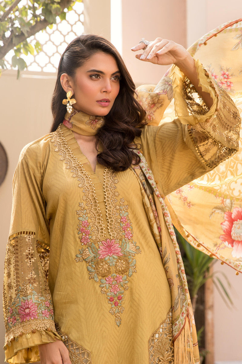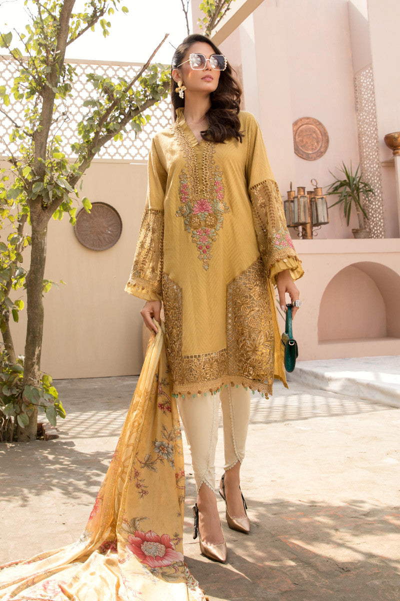 Step into elegance with our 'Golden Blossom Embroidered Brochia 3pc Stitched Suit.' Crafted with precision and adorned with intricate embroidery, this mustard-colored ensemble exudes sophistication. The luxurious Brochia fabric adds a touch of opulence, making it perfect for special occasions. Embrace the beauty of detailed craftsmanship and unmatched style as you grace any event with the radiant allure of this meticulously stitched suit.