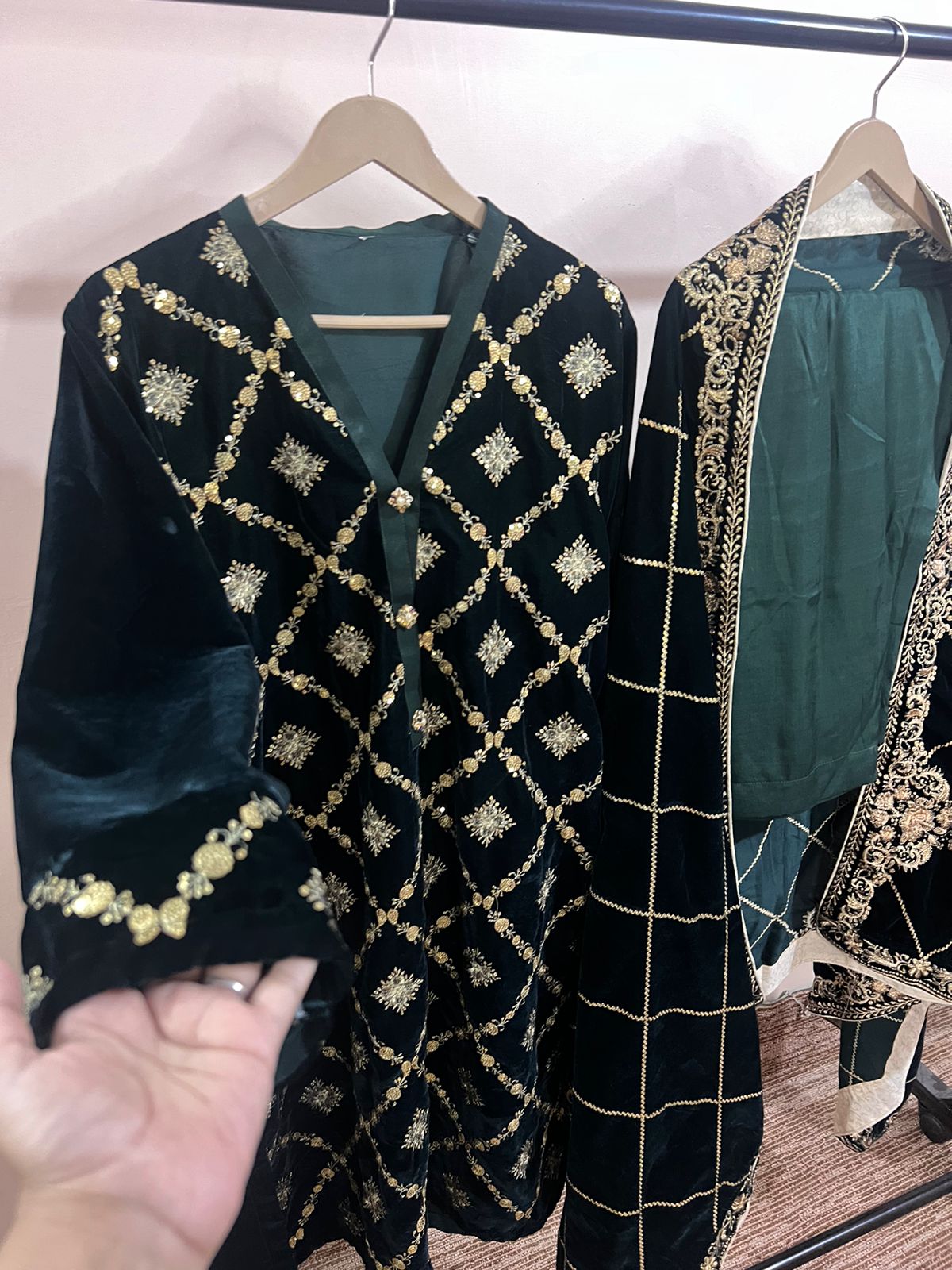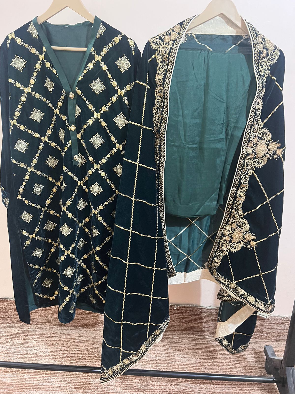 Elegance in Green: Stitched 3-Piece Velvet Ensemble with Intricate Machine Work