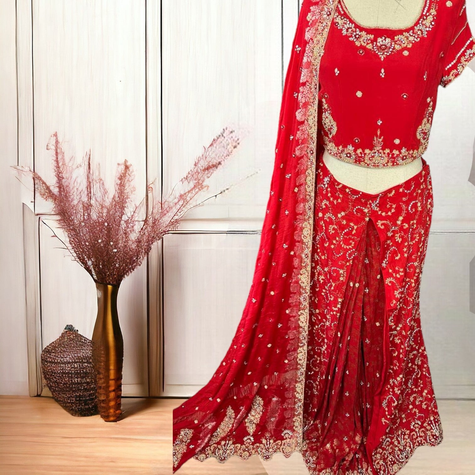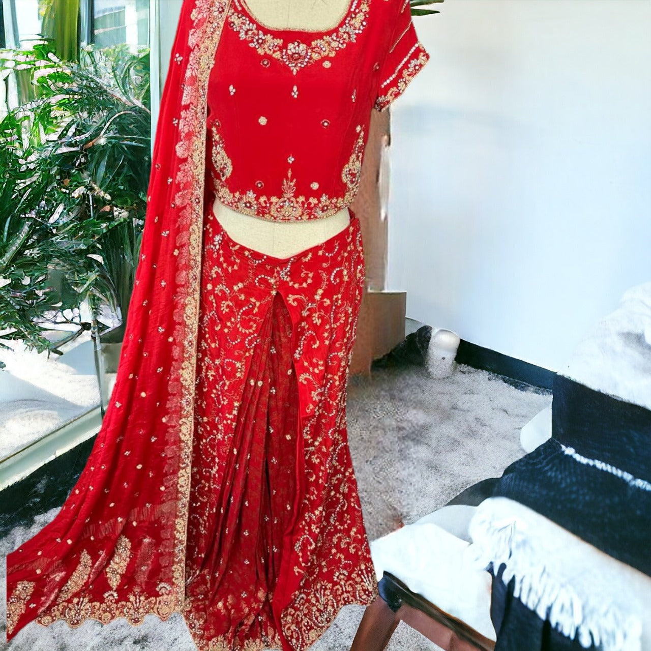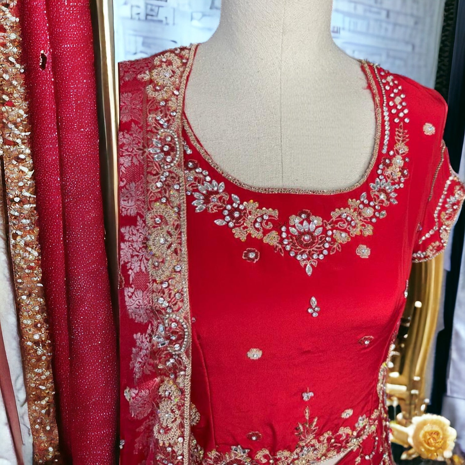 Elevate your bridal ensemble with our Scarlet Elegance Lehnga Choli. This exquisite 3-piece set features rich red chiffon adorned with intricate kora and dabka work, creating a masterpiece of craftsmanship. The meticulously stitched ensemble ensures a perfect fit, allowing you to embrace your special day with grace and sophistication. Unleash the magic of timeless beauty and tradition with this stunning red bridal lehnga choli."