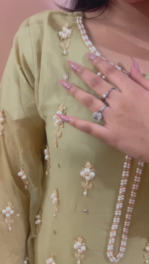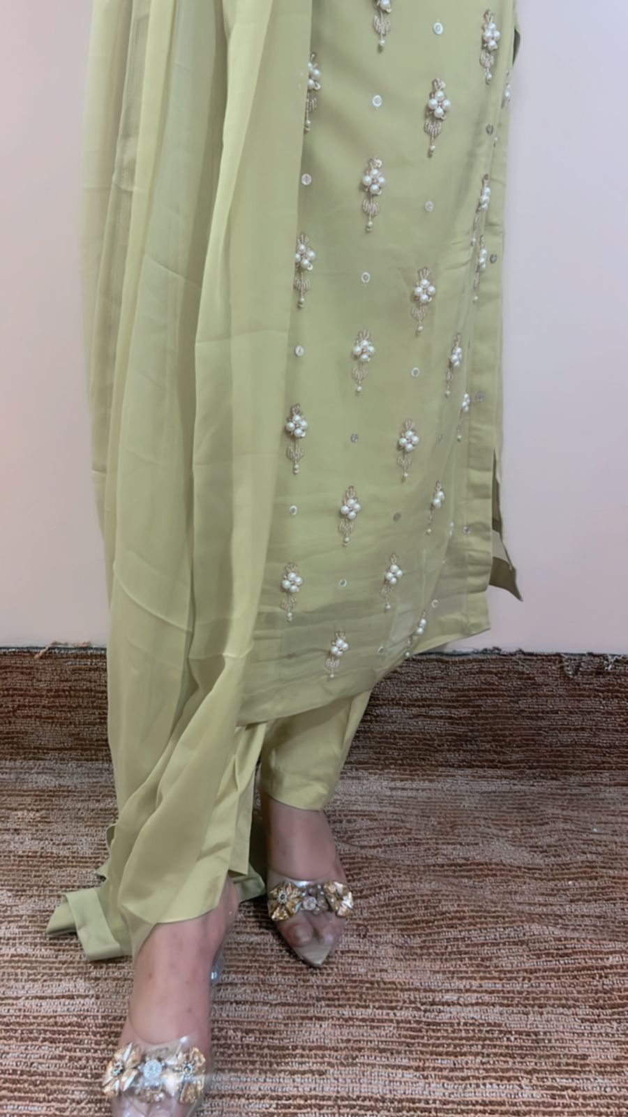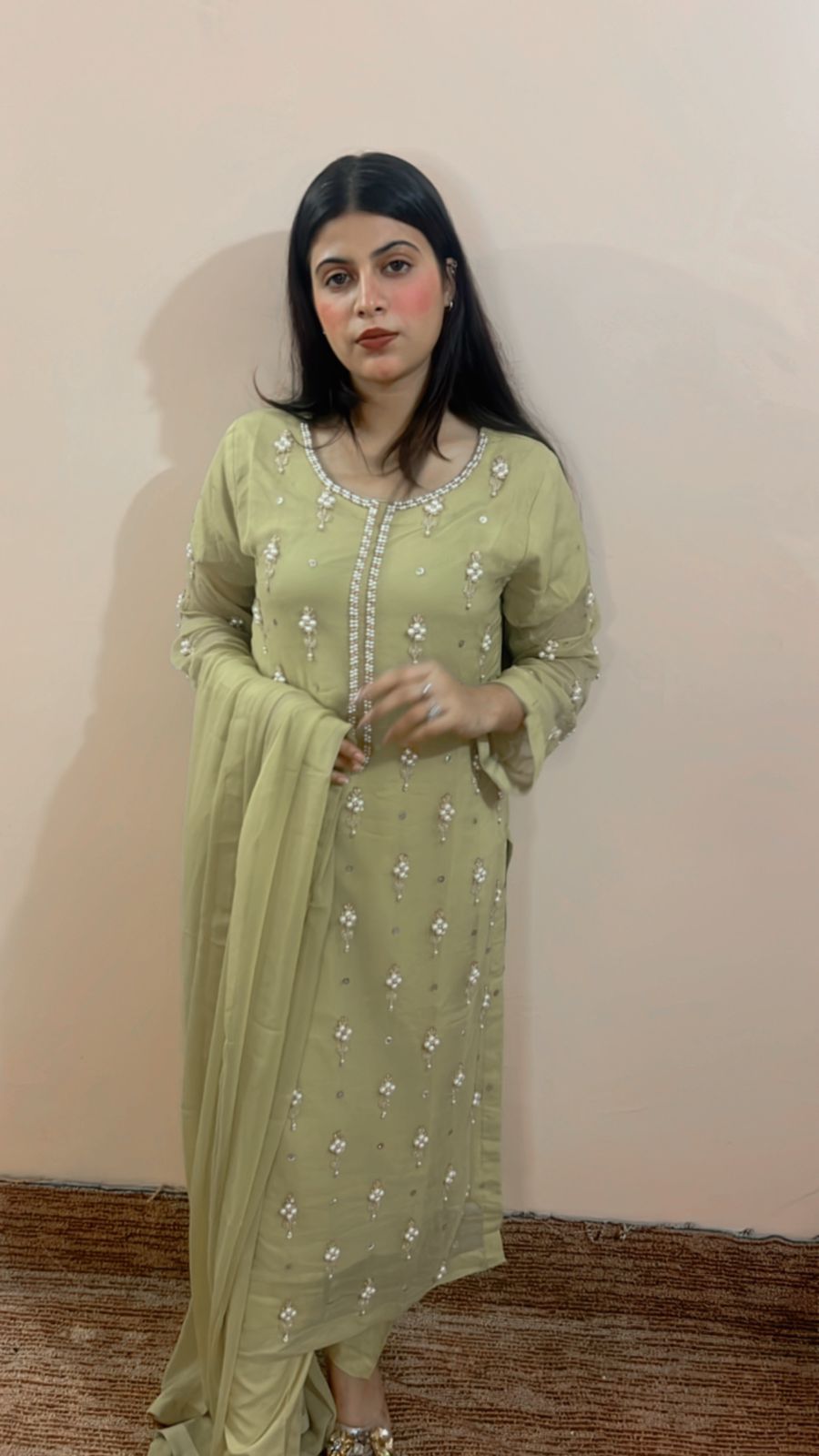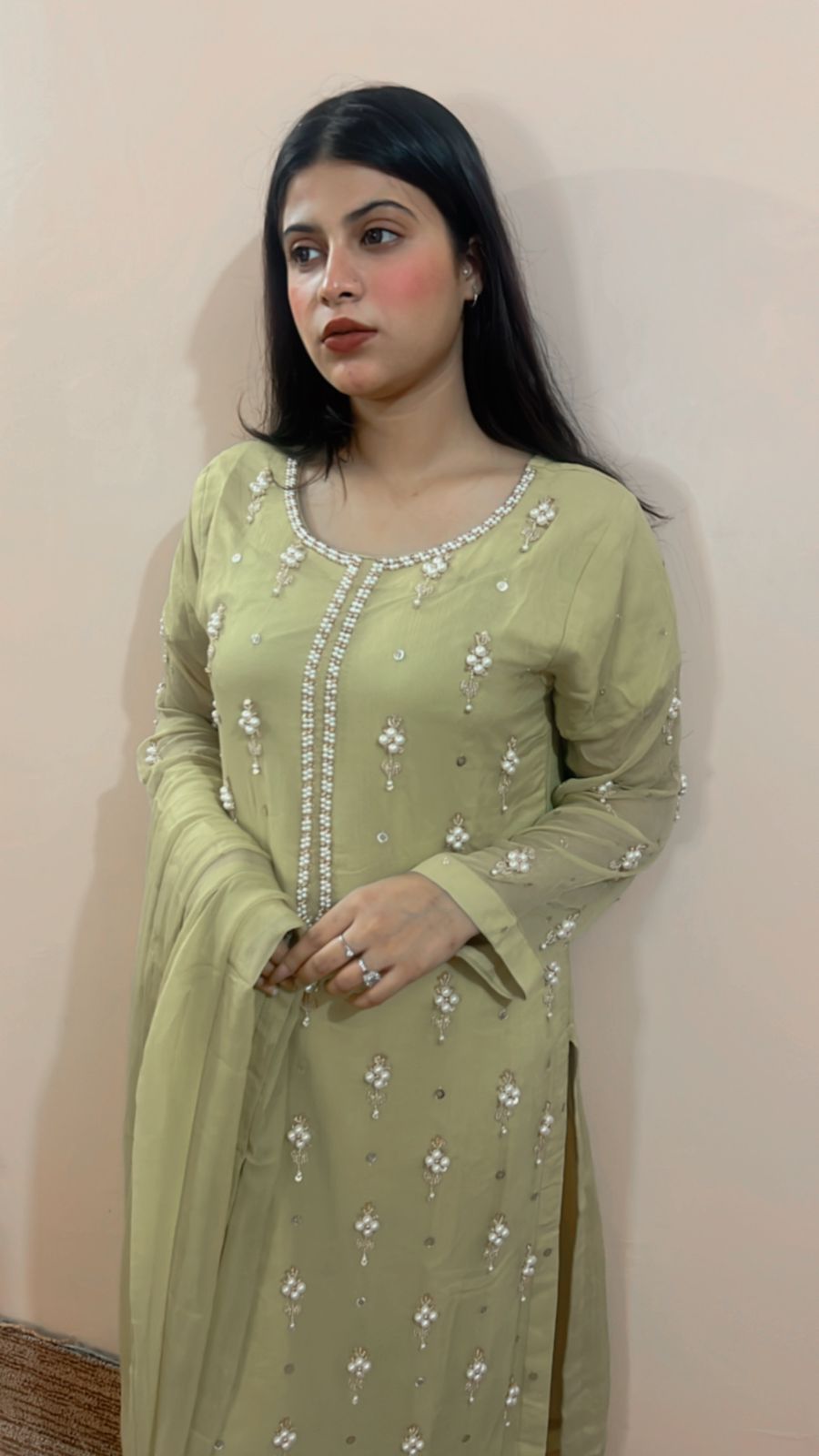 Elevate your style with our "Pearl Essence Chiffon 3pc Suit" by Olive Atelier. This meticulously stitched ensemble combines the luxurious feel of chiffon with the timeless elegance of pearls. The set includes a beautifully tailored suit with intricate detailing, offering a perfect blend of sophistication and contemporary charm.