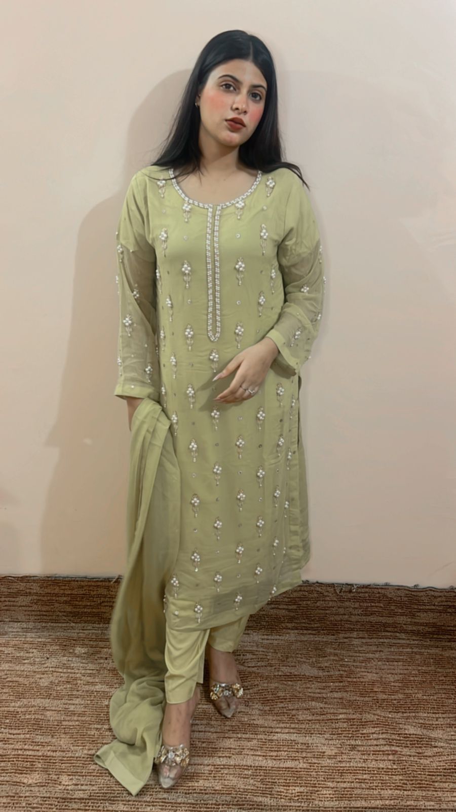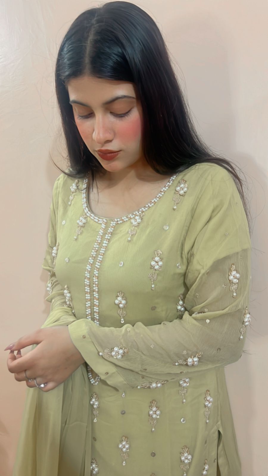 Step into grace and glamour with this exquisite three-piece suit, a seamless fusion of traditional craftsmanship and modern style. Perfect for special occasions, the Pearl Essence Chiffon 3pc Suit is a statement of refined taste and elegance.