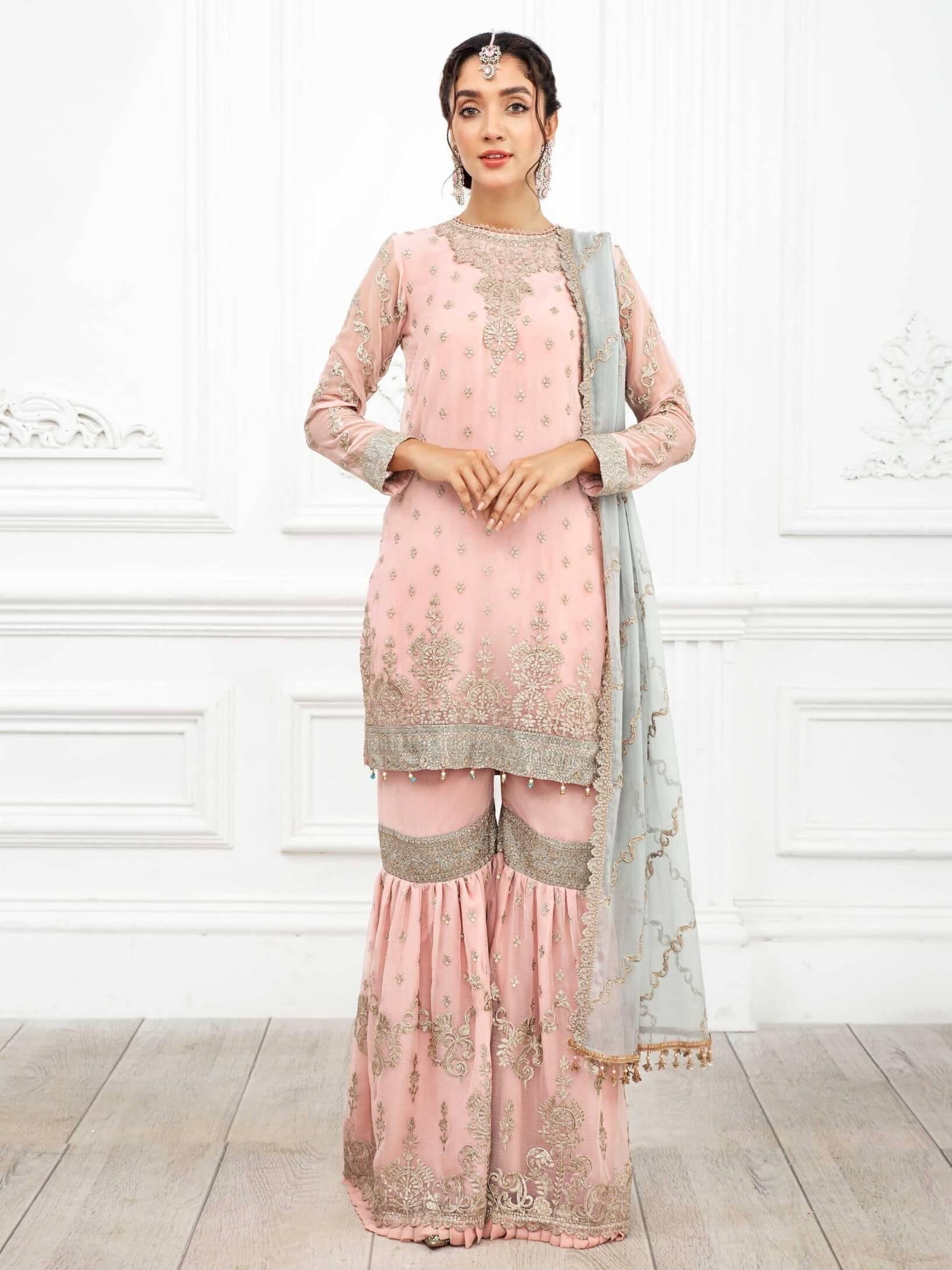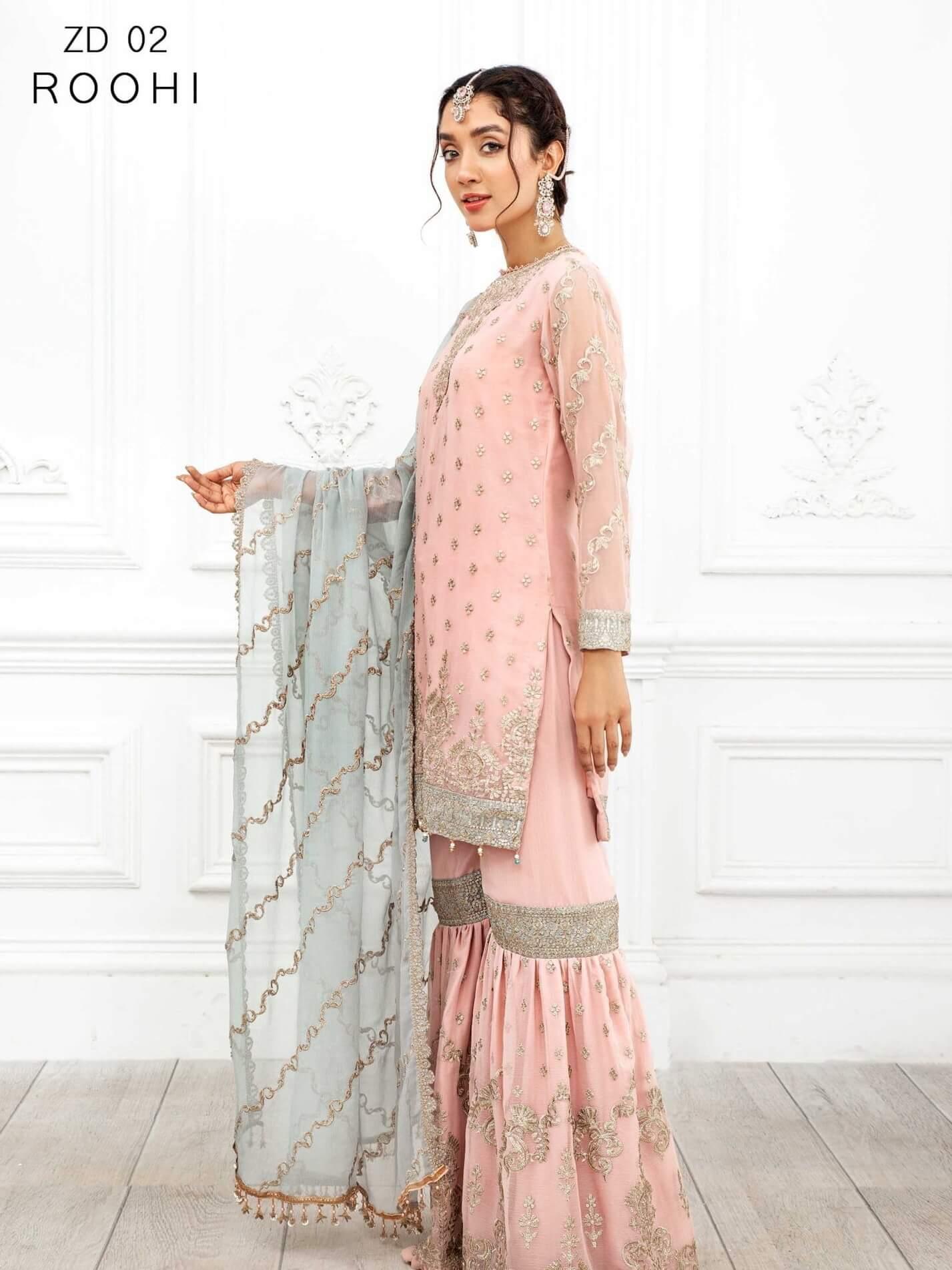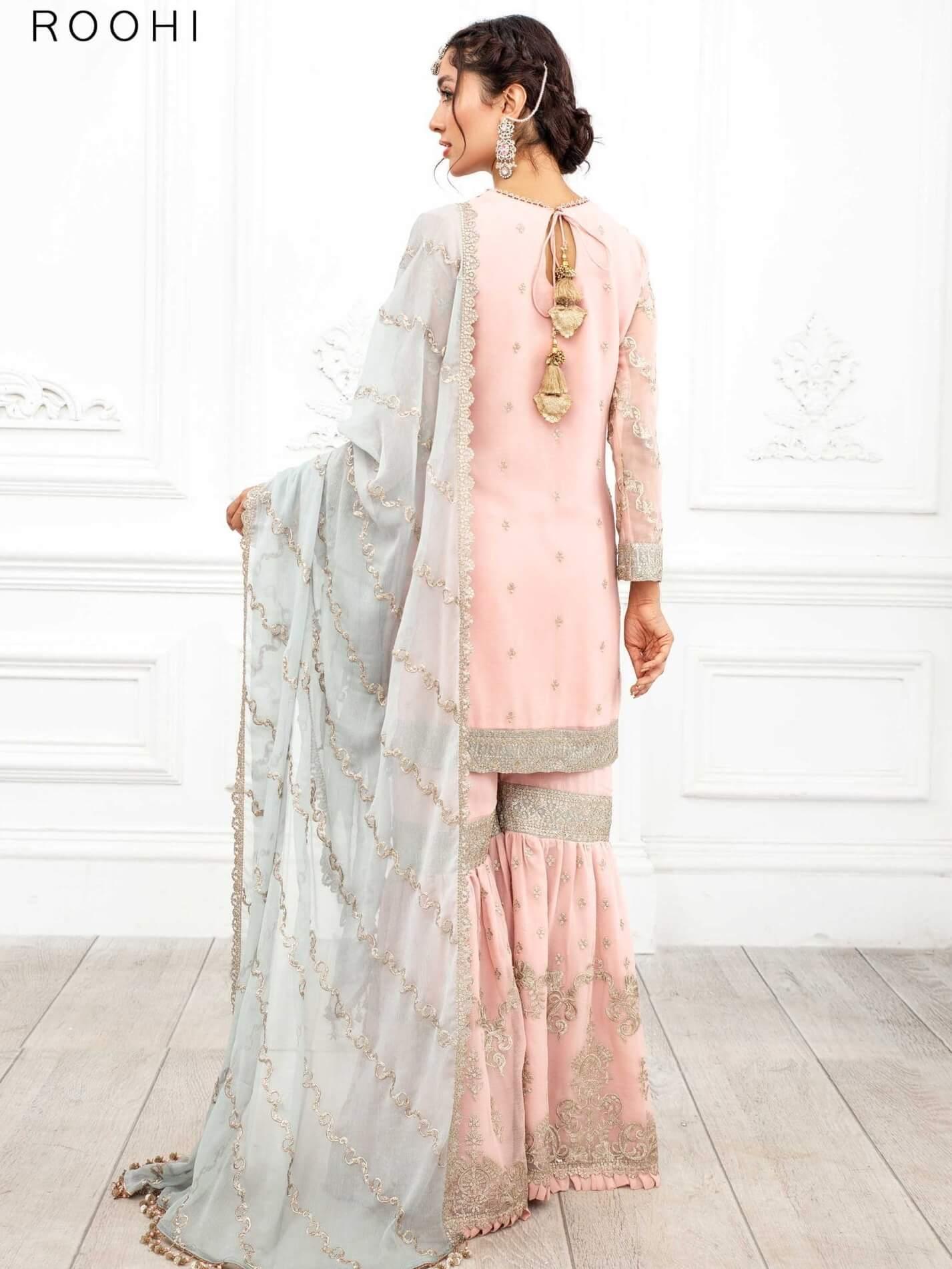 Embrace the elegance of Roohi, where traditional charm meets contemporary fashion in this exquisite 3pc gharara suit.