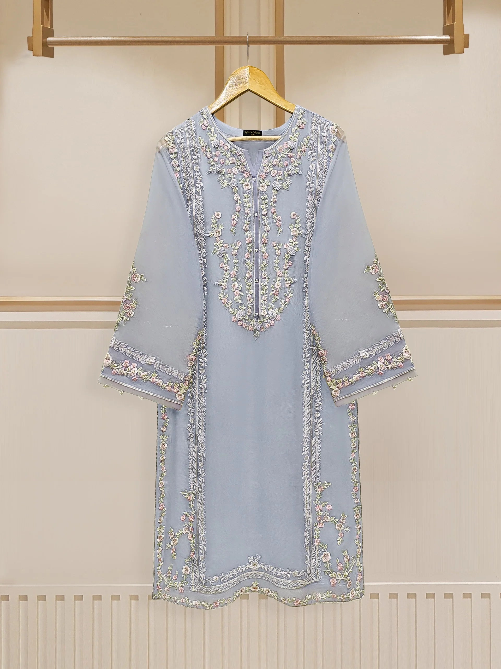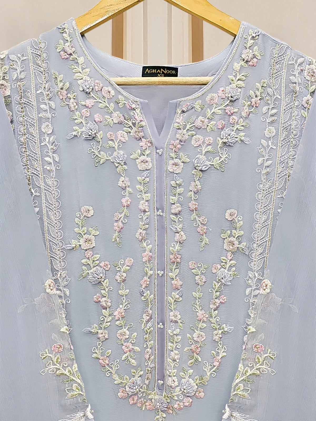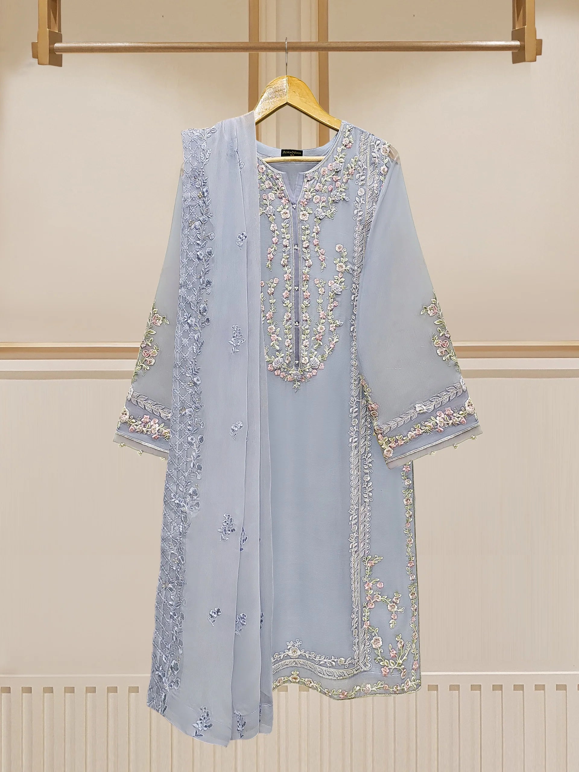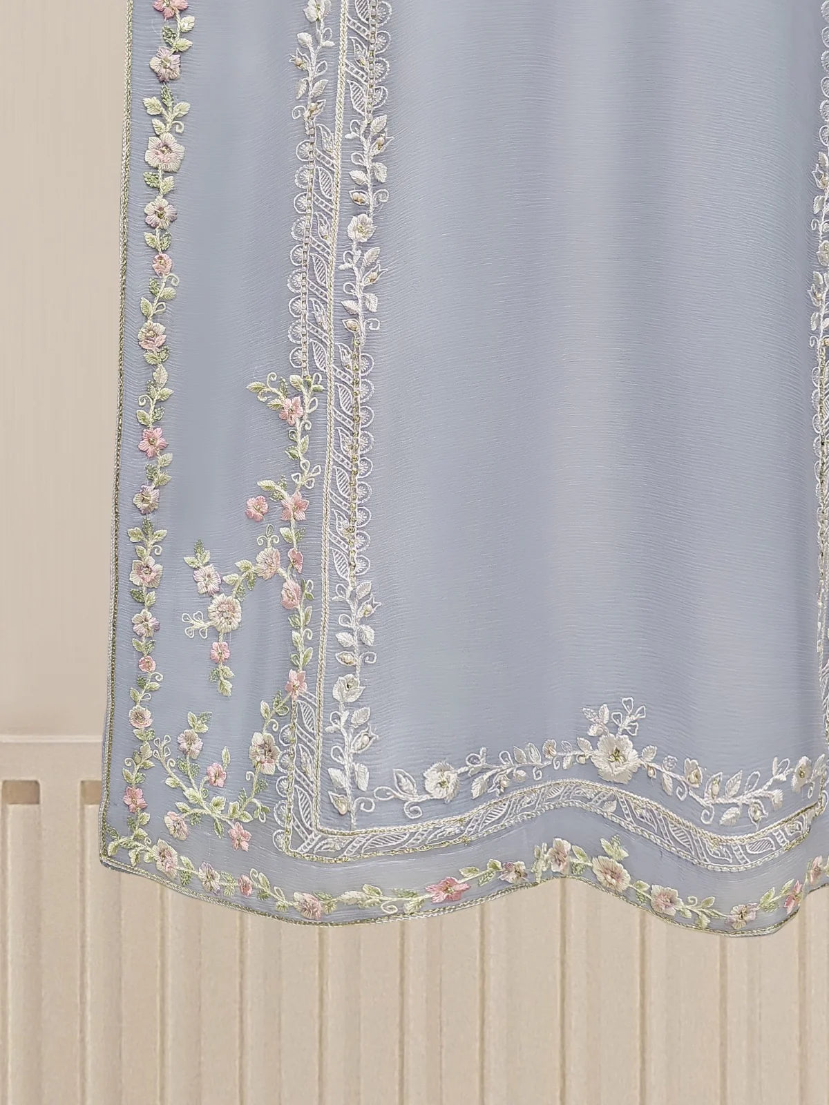 Introducing our elegant embroidered chiffon shirt with dupatta and pant a perfect choice for those who appreciate intricate detailing and graceful style. Crafted from high-quality chiffon fabric, this shirt offers a lightweight and luxurious feel, allowing you to feel comfortable and chic throughout the day. The set comes with matching pants which enhances the overall look and adds a touch of finesse to your outfit.