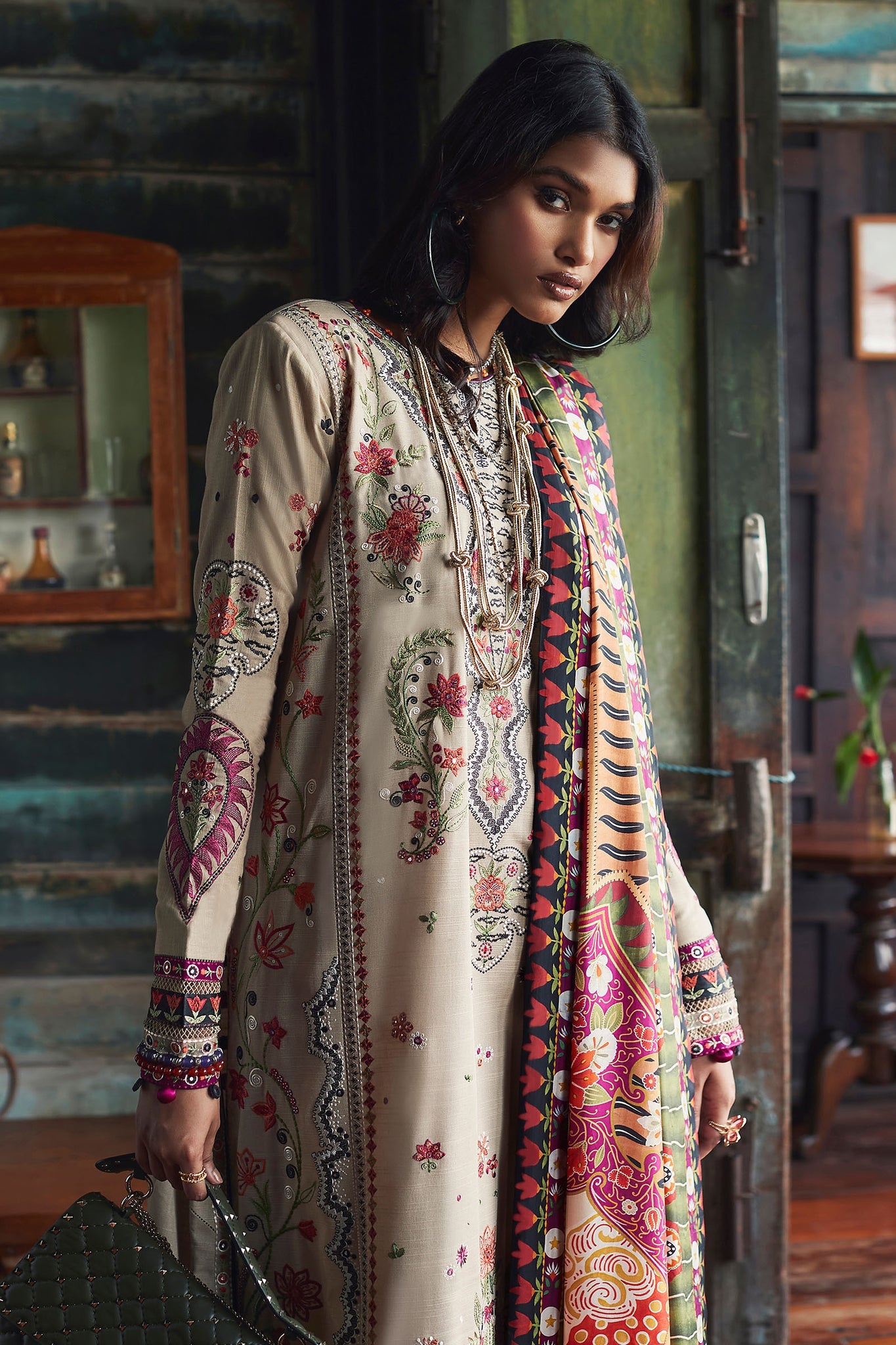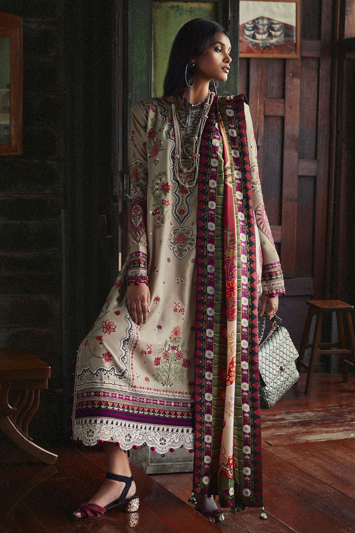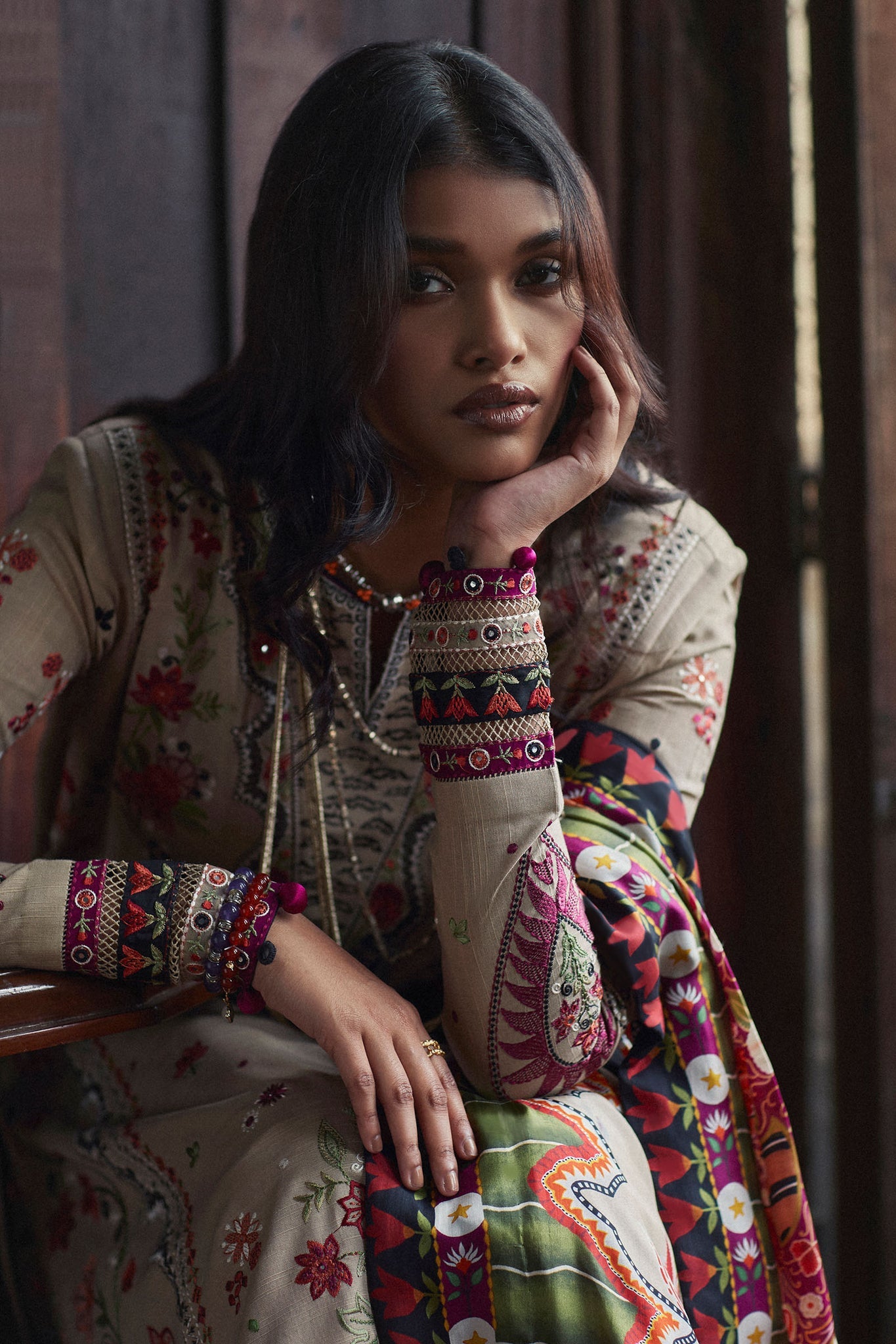 A creamy beige canvas of ’Berina’ is delicately adorned with a mélange of delicate threads laid beautifully in shades of scarlet, tangerine, moss, ivory and sage. Vibrant, exquisitely embroidered borders depict varrying hues to lend contrast creating a striking composition. It comes paired with a lush pure medium silk dupatta to complete the stunning look that will be a collector’s dream; regal, timeless and luxurious.