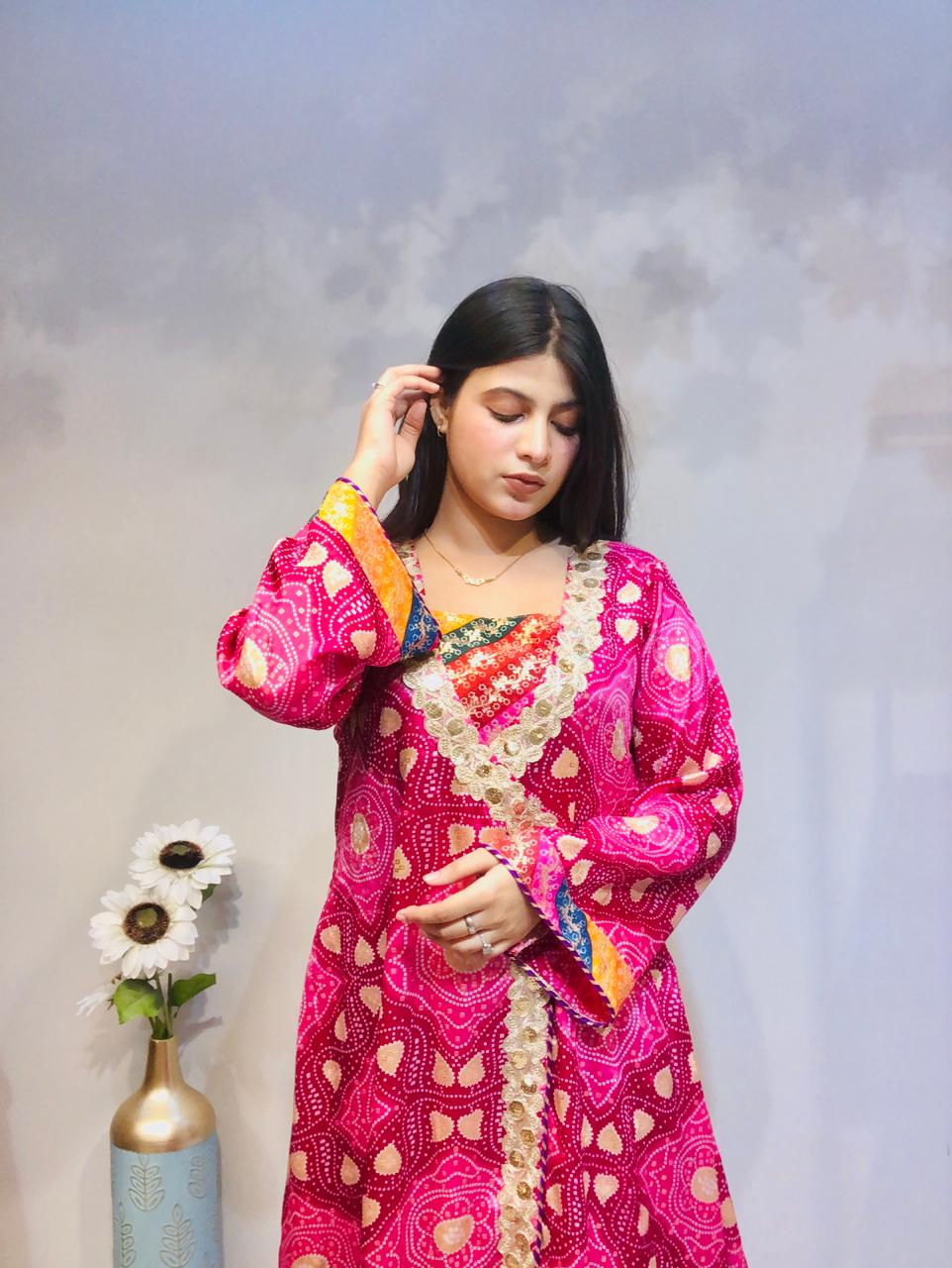 Whether you're attending a festive event or a special celebration, "Chunri Charm" adds a touch of sophistication to your wardrobe. Embrace the timeless beauty of silk, adorned with the classic charm of chunri patterns, and make a statement at every gathering. Elevate your style with this enchanting, stitched ensemble that captures the essence of feminine grace.