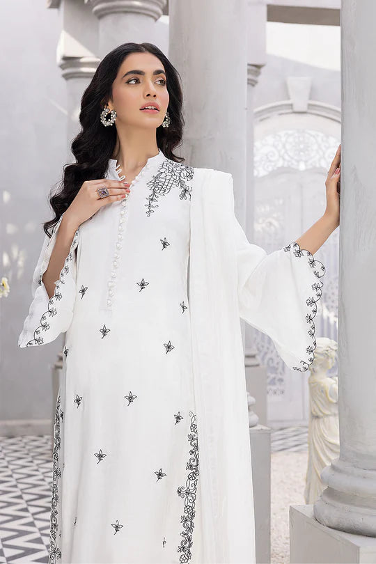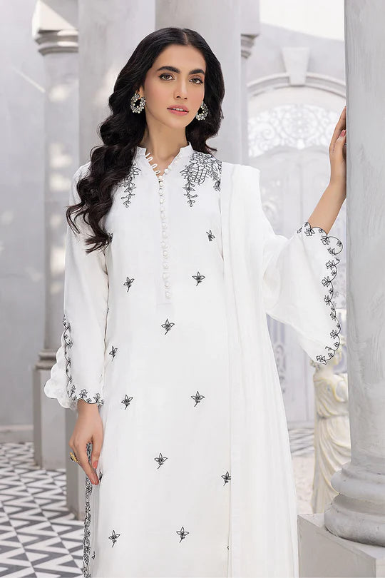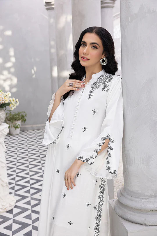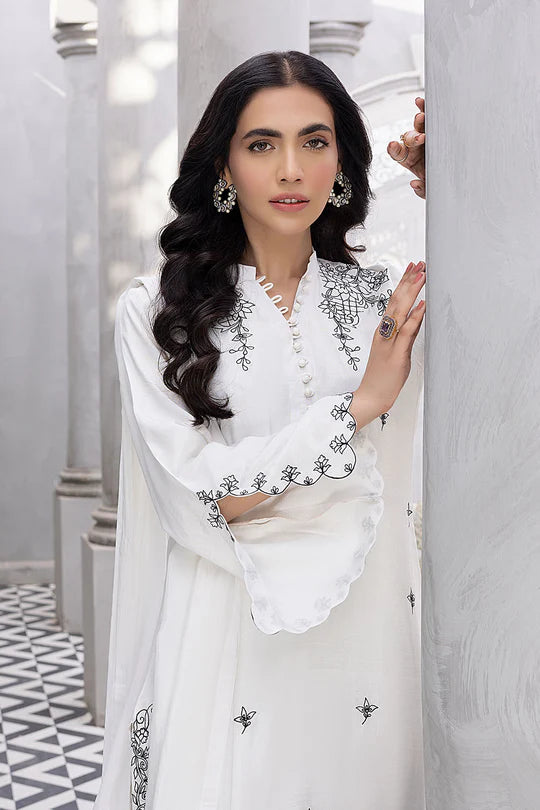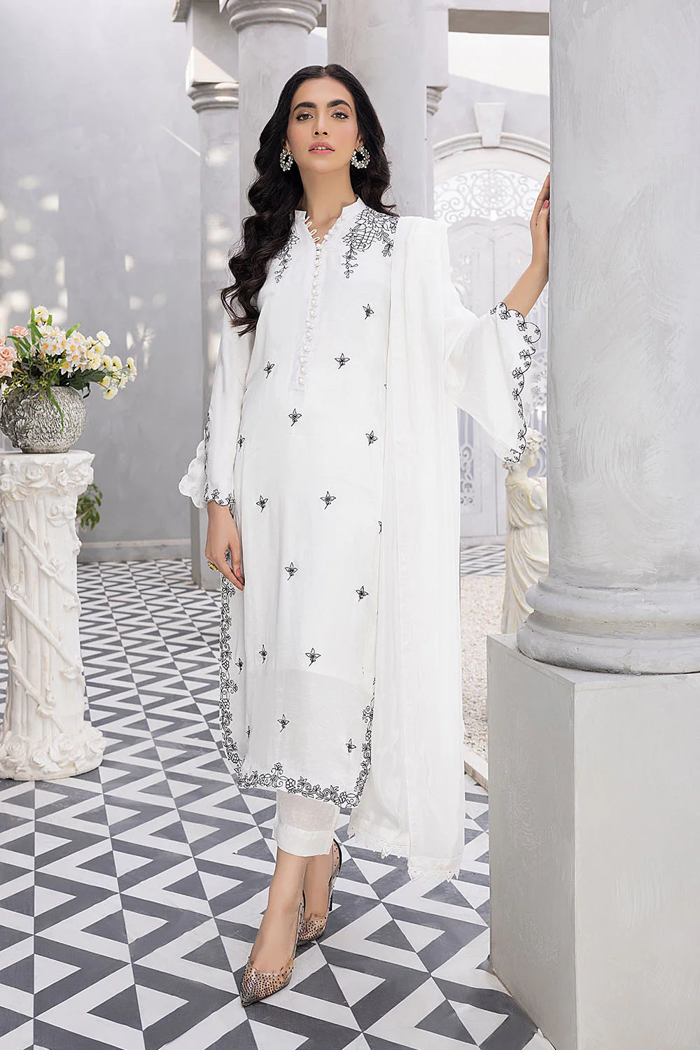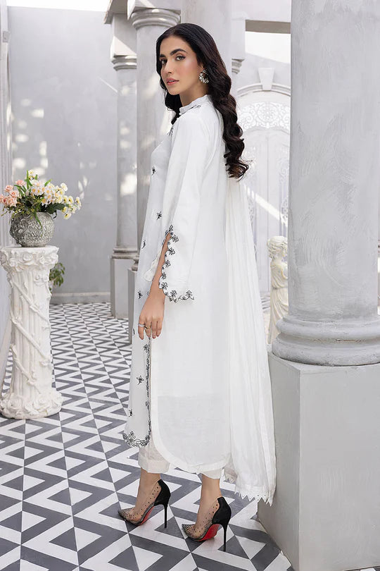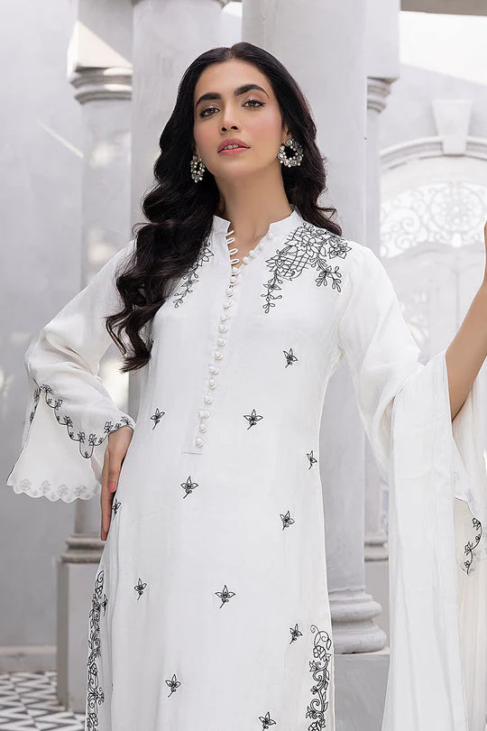 An elegant raw silk silhouette rendered in a lovely white color. The shirt plays up delicate embroidery all over the canvas with a hoop button neckline and trendy cut sleeves making it a classy outfit. It comes with raw silk straight pants and a chiffon dupatta festoon with lace-finished pallu creating it an epitome of sophistication.