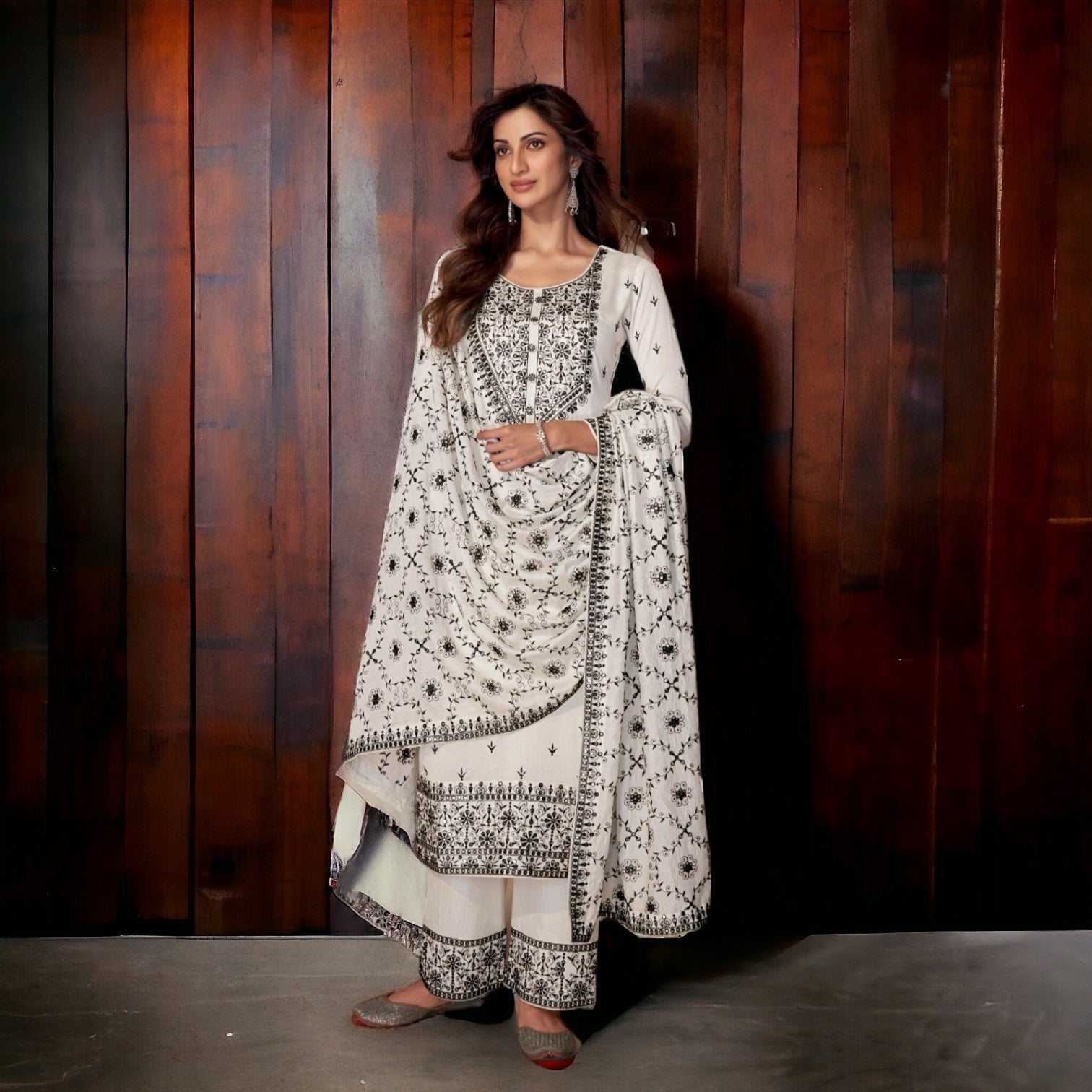 Step into timeless elegance with our Monochrome Silk 3pc Suit. Meticulously stitched for a flawless fit, this ensemble in black and white exudes sophistication. Elevate your style effortlessly with this classic masterpiece, perfect for any special occasion.