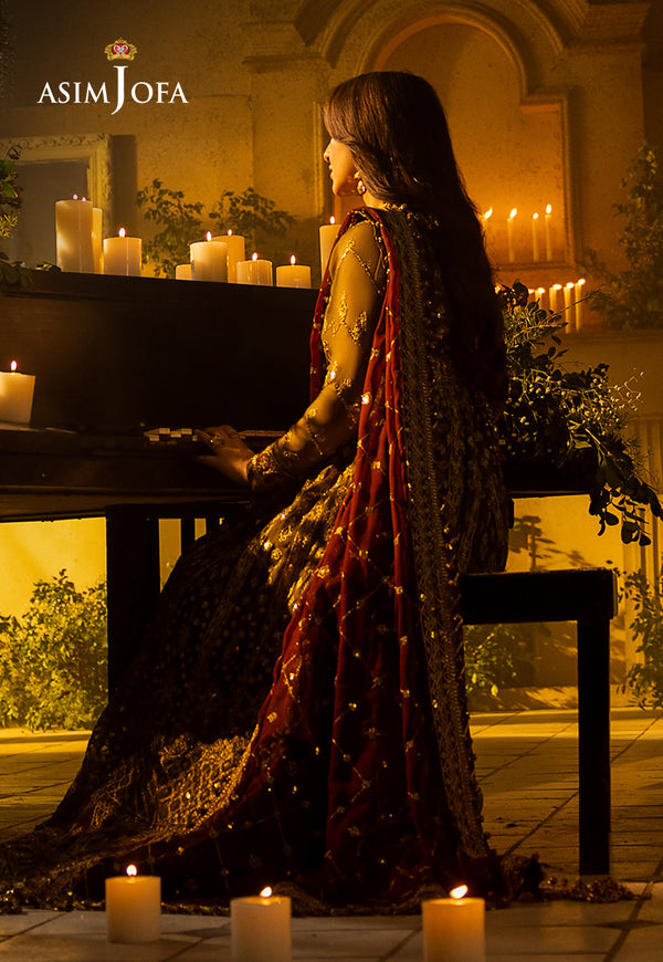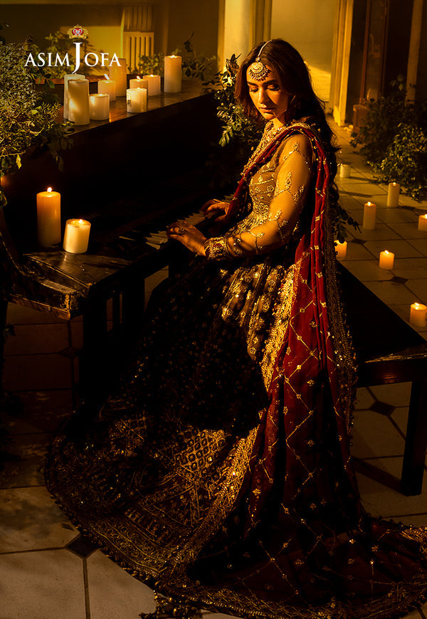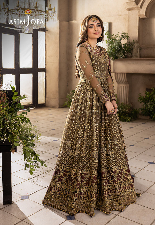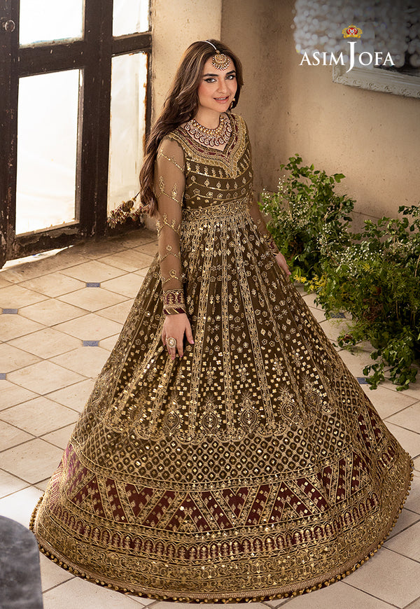 Wrap yourself in the Olive Reverie Ensemble—an ethereal ethnic piece adorned with gold 5mm sequins, maroon thread, and resplendent gold zari. The olive green peshwas is a reverie in itself which becomes a masterpiece of intricate embroidery. The embroidered kalis and the embroidered bodice are strokes of elegance. Sleeves adorned with an embroidered jaal and border along with the ghera, complete this enchanting ensemble. The maroon dupatta with its four side borders becomes the final verse—a poetic olive reverie that captures the essence of timeless elegance.