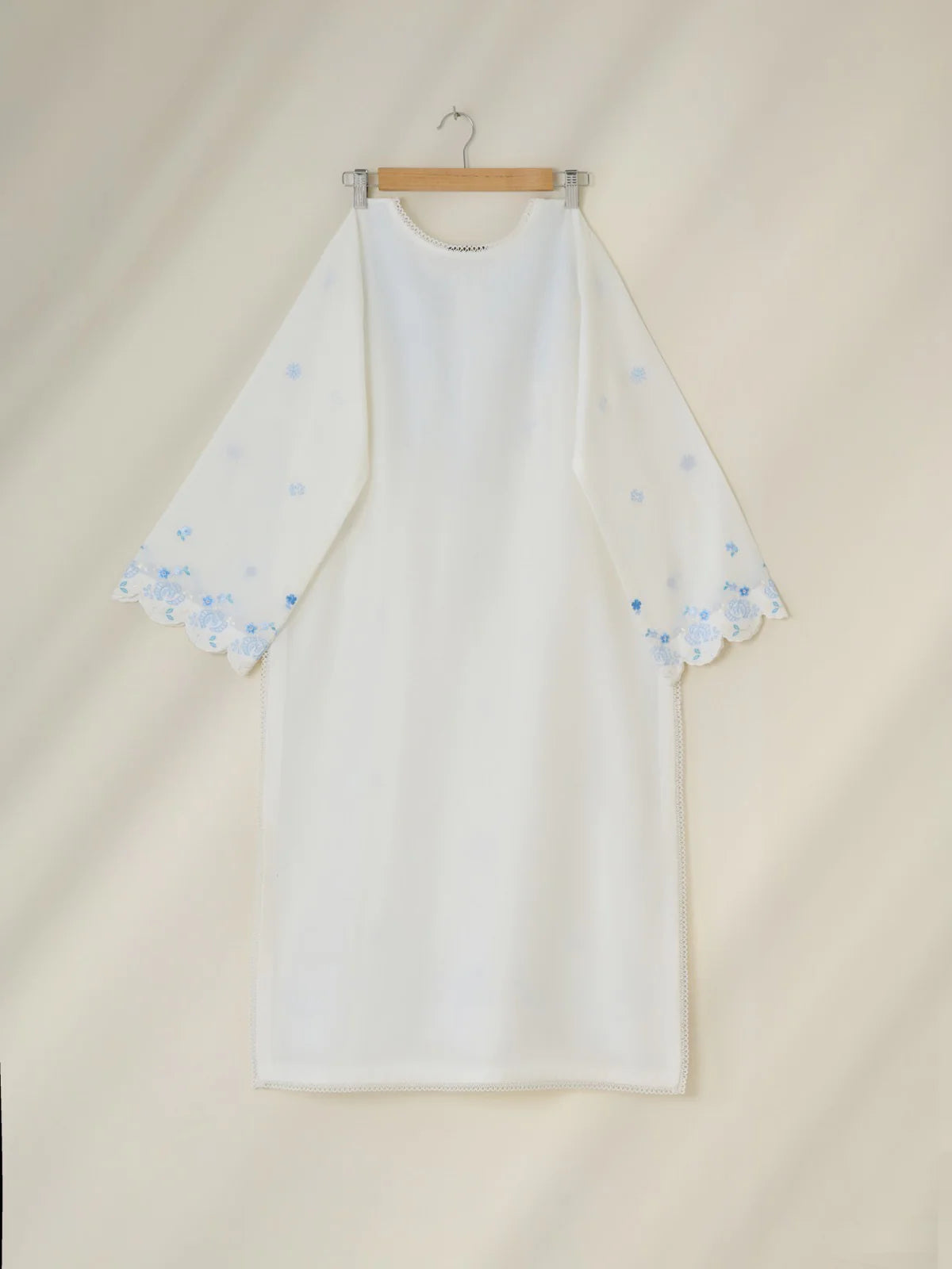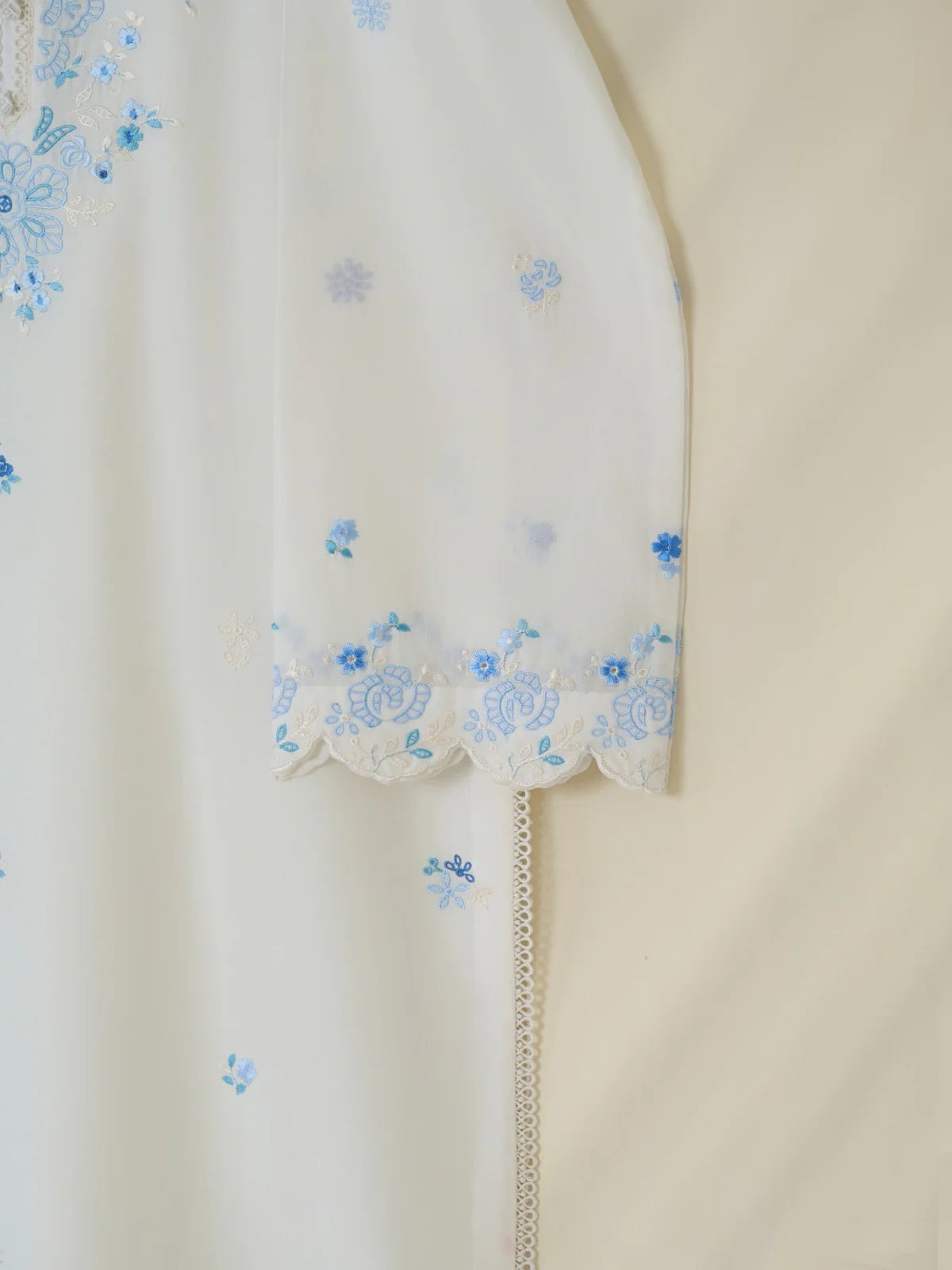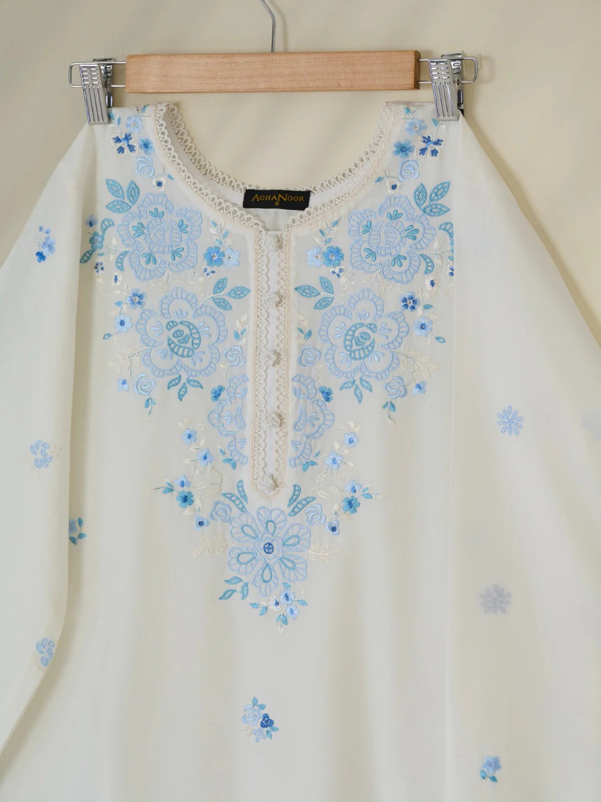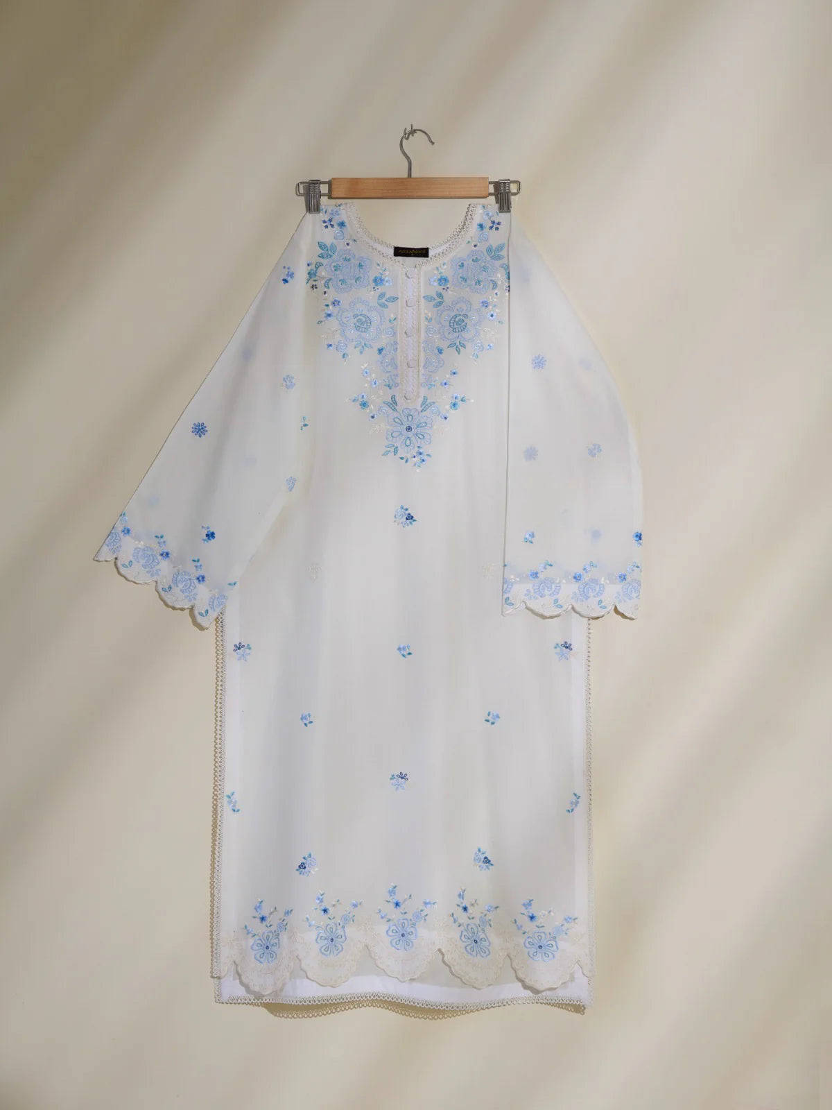 Expertly crafted with a delicate white cambric fabric, this embroidered shirt showcases intricate thread work for a subtle yet elegant touch. The perfect addition to any wardrobe, this shirt exudes quality and sophistication.