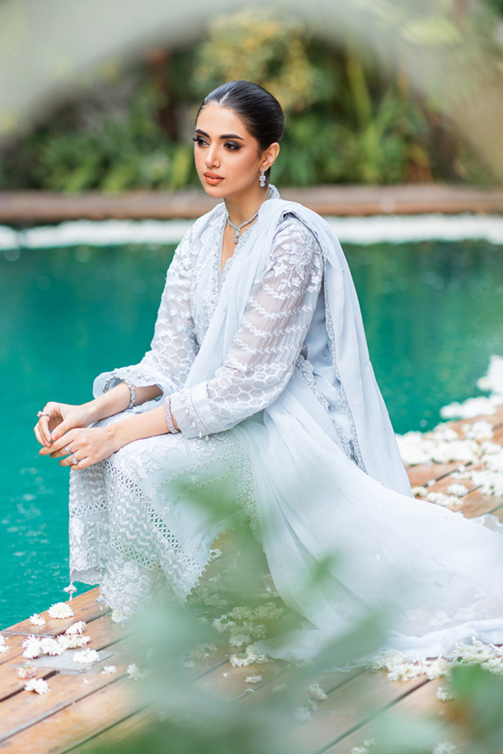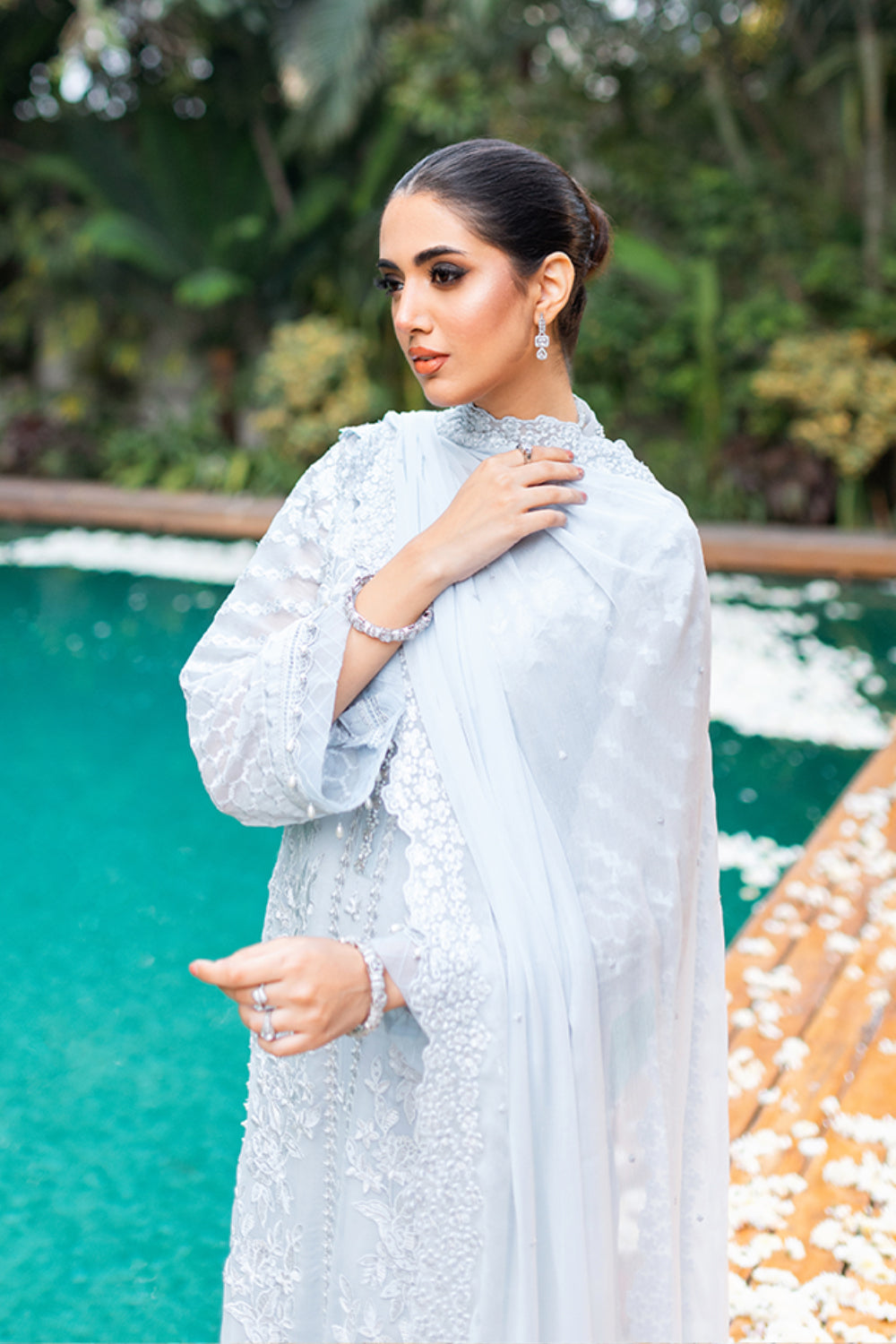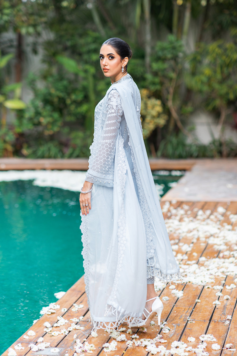 'Granite Grace' is perfect for a timeless and elegant look. Crafted with a chiffon ensemble in a gracious grey tone with a delicately embroidered front and sleeves with a hand-embellished neckline, this ensemble is sure to impress. Paired with a chiffon embroidered dupatta and raw silk bottoms with an embroidered hemline, it is ideal for formal occasions.