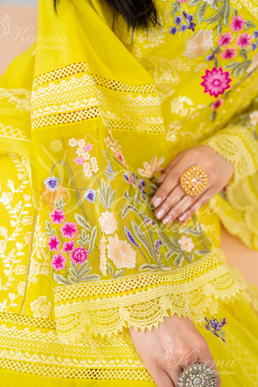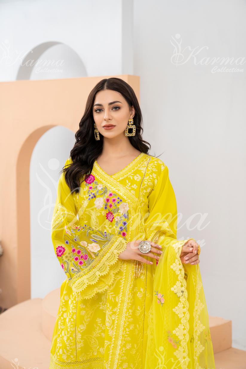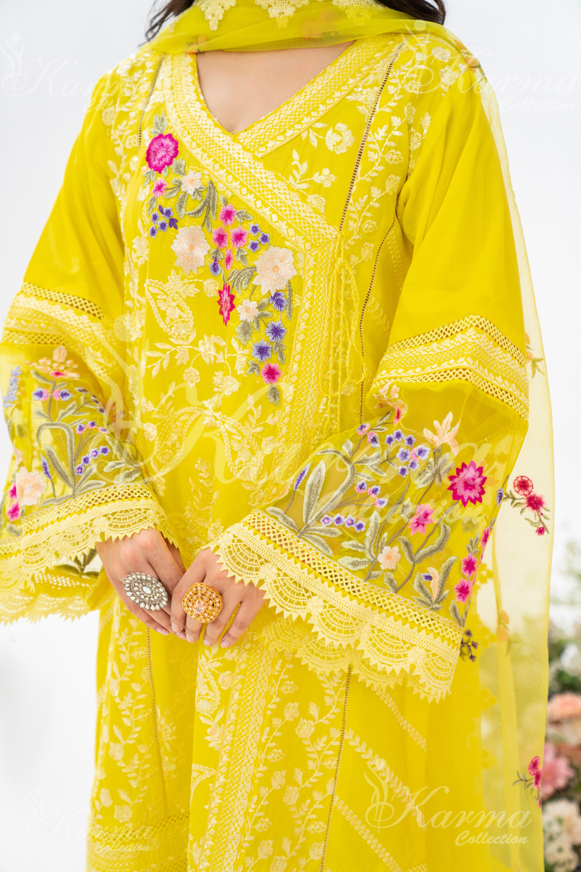This stunning ensemble comes stitched and includes an organza dupatta. The angarkha-style design features intricate embroidery on the front, border, sleeves, and dupatta, adding elegance to your look. Discover the beauty of vibrant yellow and embrace the timeless charm of traditional embroidery.