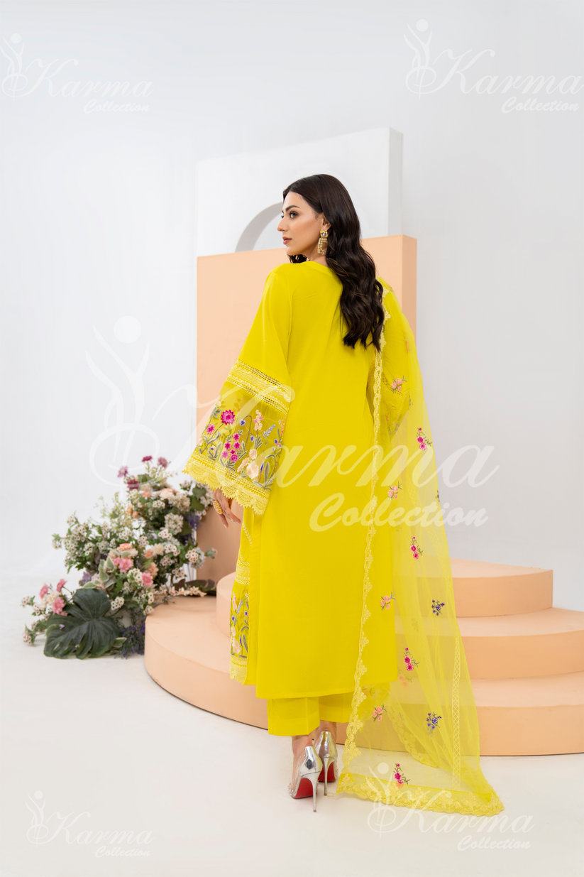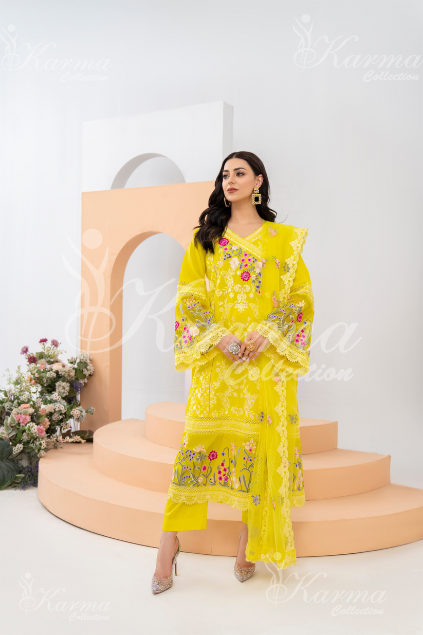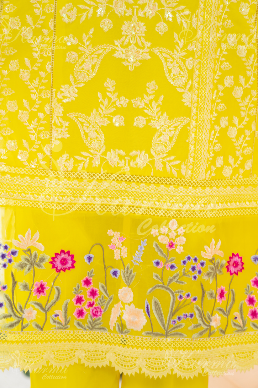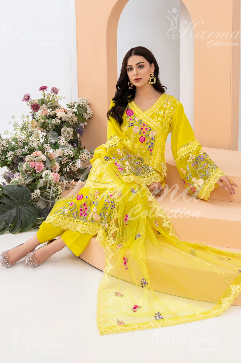 This stunning ensemble comes stitched and includes an organza dupatta. The angarkha-style design features intricate embroidery on the front, border, sleeves, and dupatta, adding elegance to your look. Discover the beauty of vibrant yellow and embrace the timeless charm of traditional embroidery.