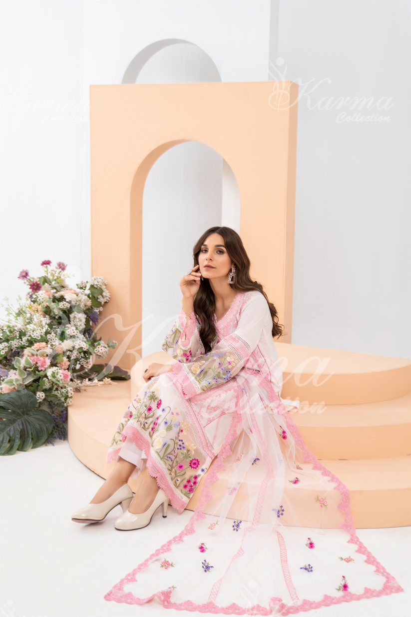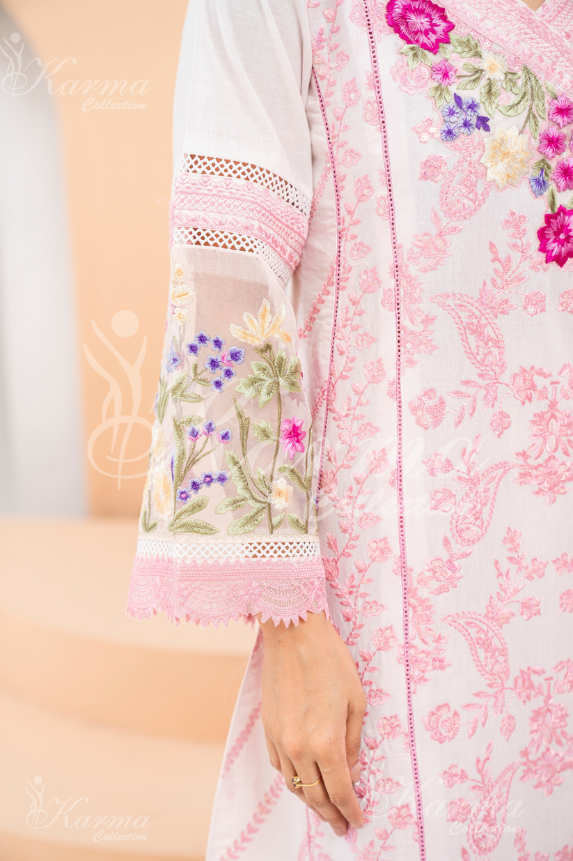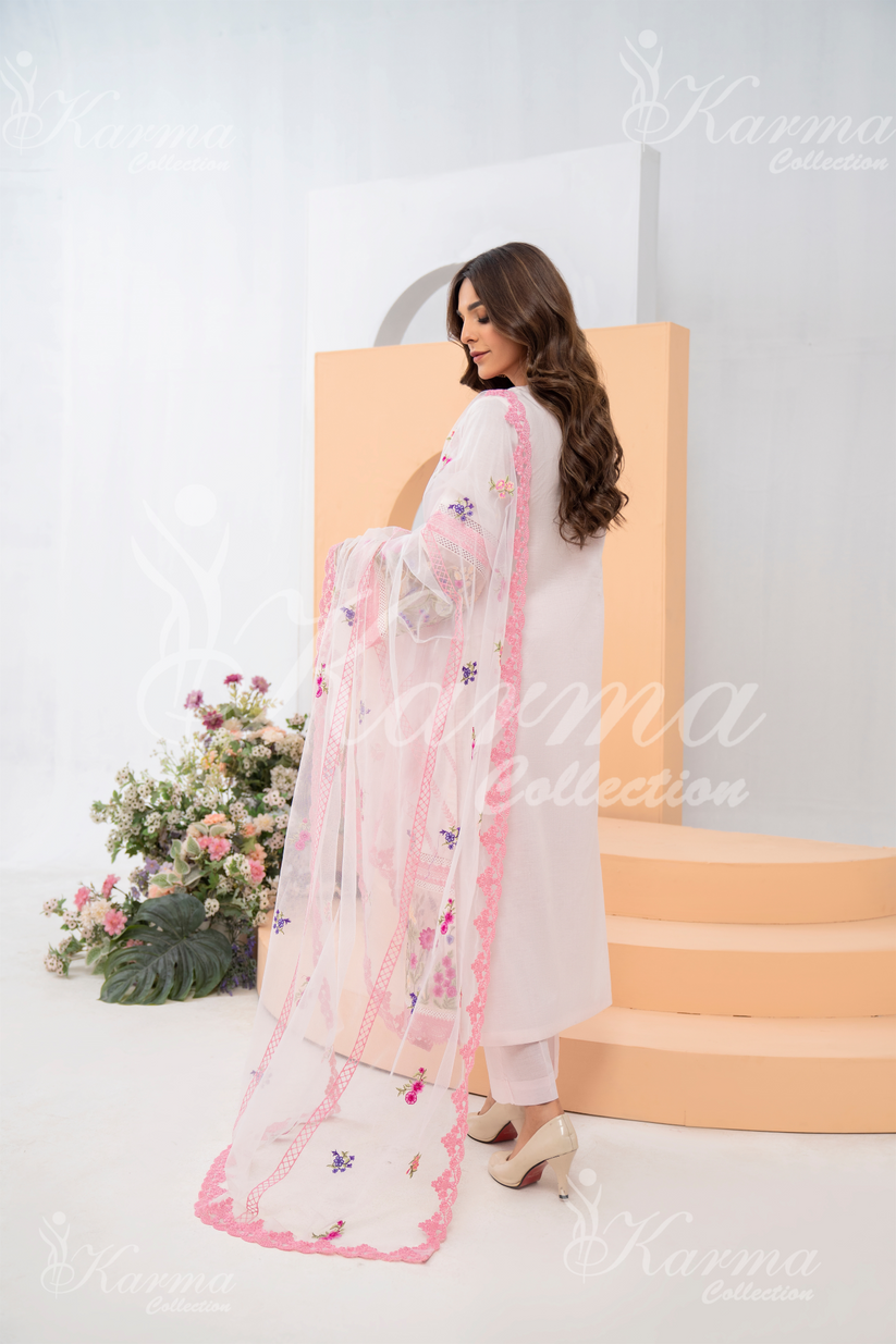 "Petal Pink Karma 3-Piece Stitched Suit" - a masterpiece of elegance and grace. This exquisite ensemble features delicate embroidery on the front, intricate border detailing on the sleeves, and a stunning organza dupatta adorned with matching embroidery. Crafted with precision and care, this suit is a true reflection of timeless style and sophistication.