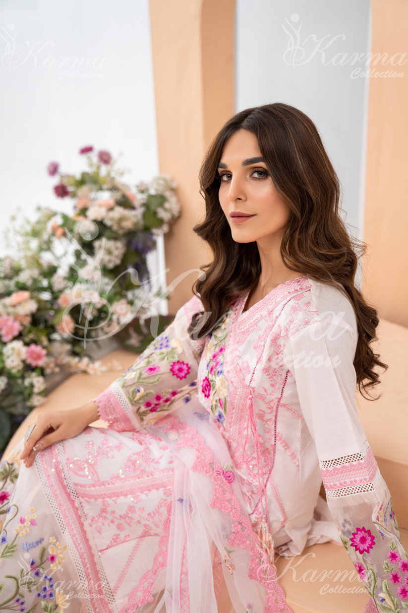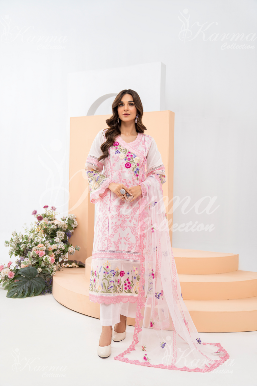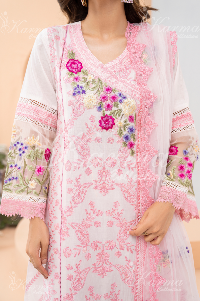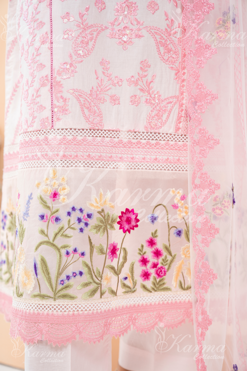 "Petal Pink Karma 3-Piece Stitched Suit" - a masterpiece of elegance and grace. This exquisite ensemble features delicate embroidery on the front, intricate border detailing on the sleeves, and a stunning organza dupatta adorned with matching embroidery. Crafted with precision and care, this suit is a true reflection of timeless style and sophistication.