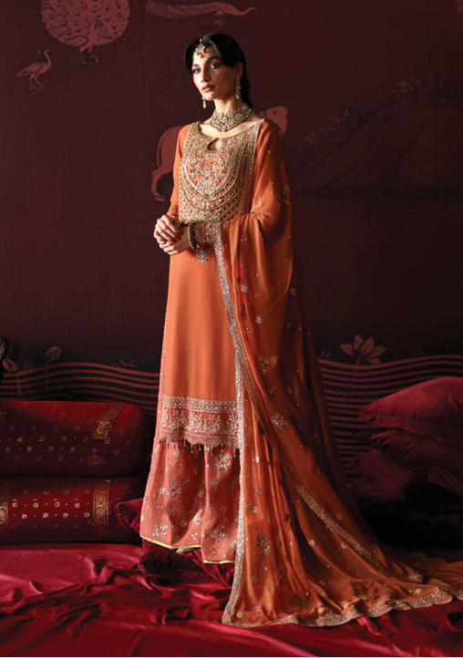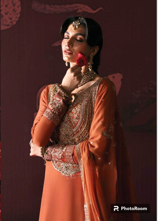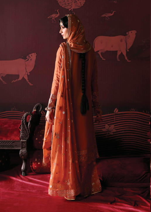 Chic sophistication in each chiffon cloth for the front, lower back, and sleeves, paired with a chiffon embroidered dupatta. Featuring an organza embroidered hand-crafted neckline, borders on the front, lower back, and sleeves, and a paloo border at the dupatta. Complete the appearance with raw silk embroidered trousers.