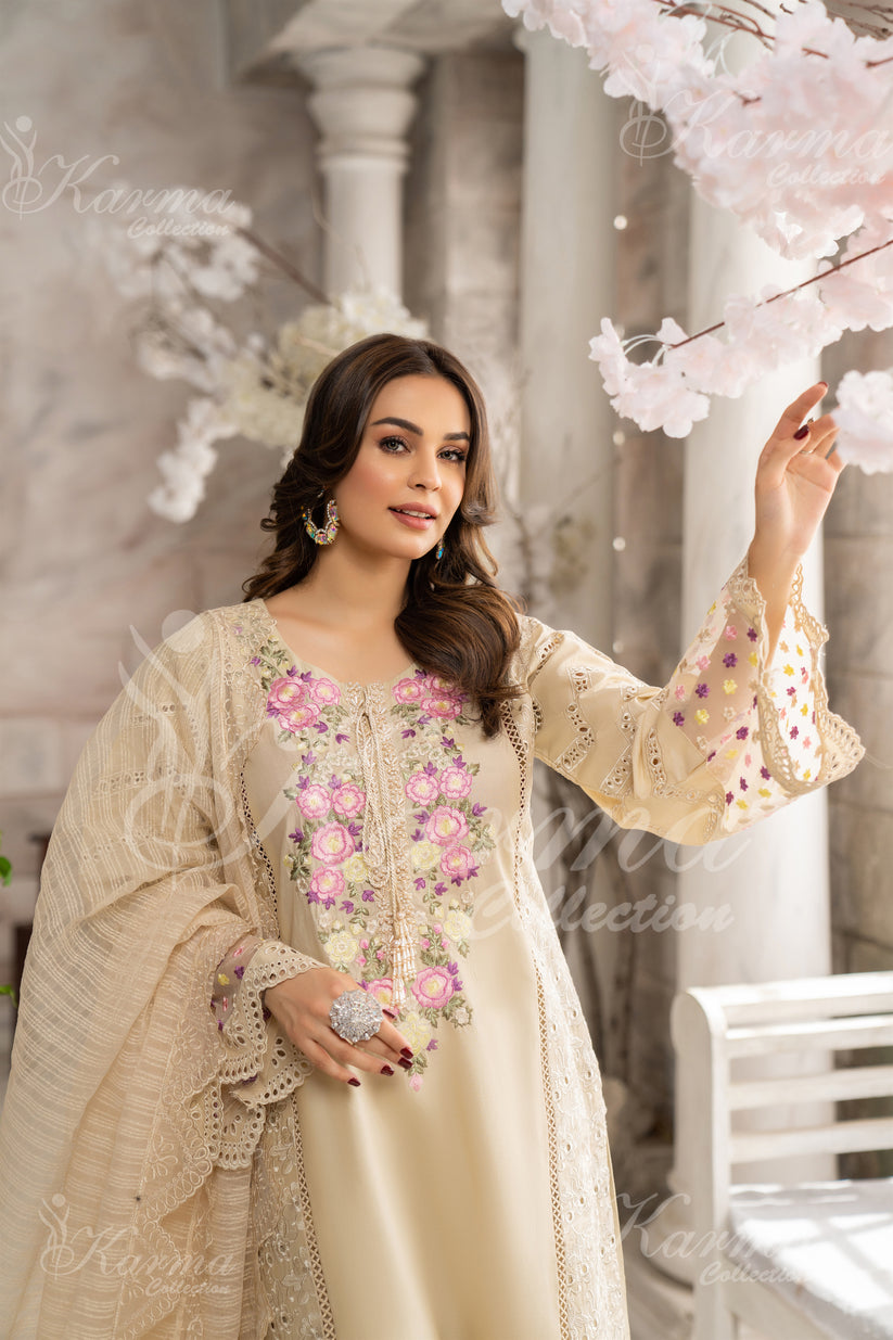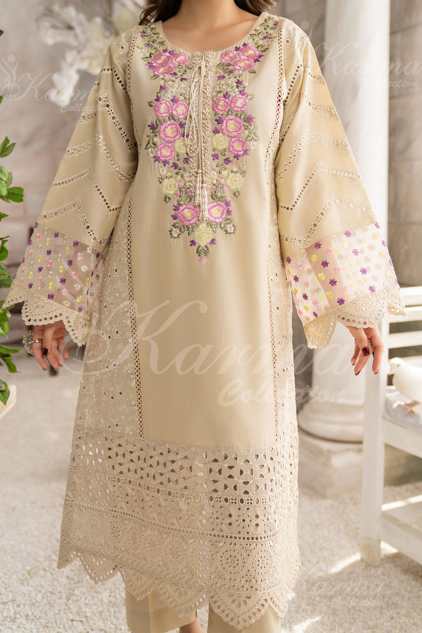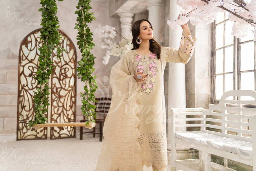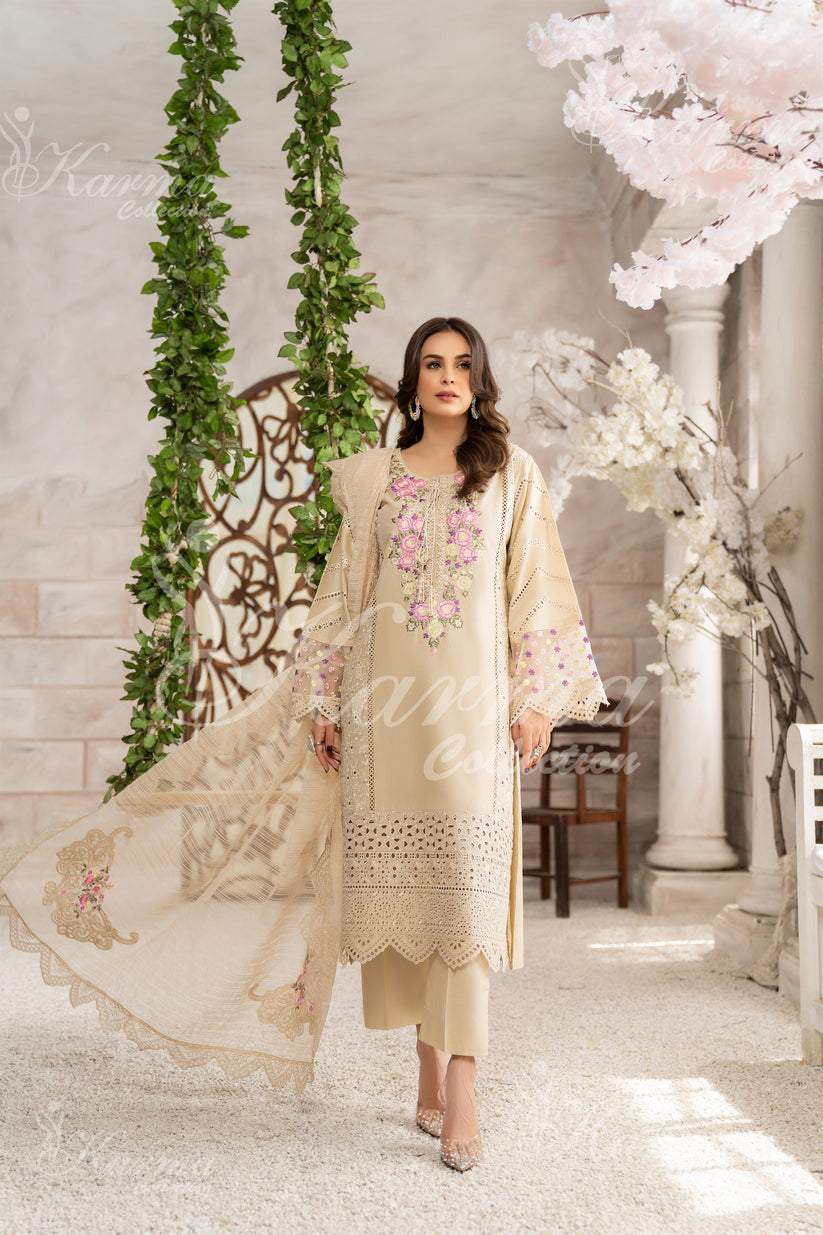 Introducing the epitome of luxury and style - the KARAMA Collection's "Luxurious Tan Hue," a meticulously crafted 3pc Cotton Suit with a dreamy Organza Dupatta.