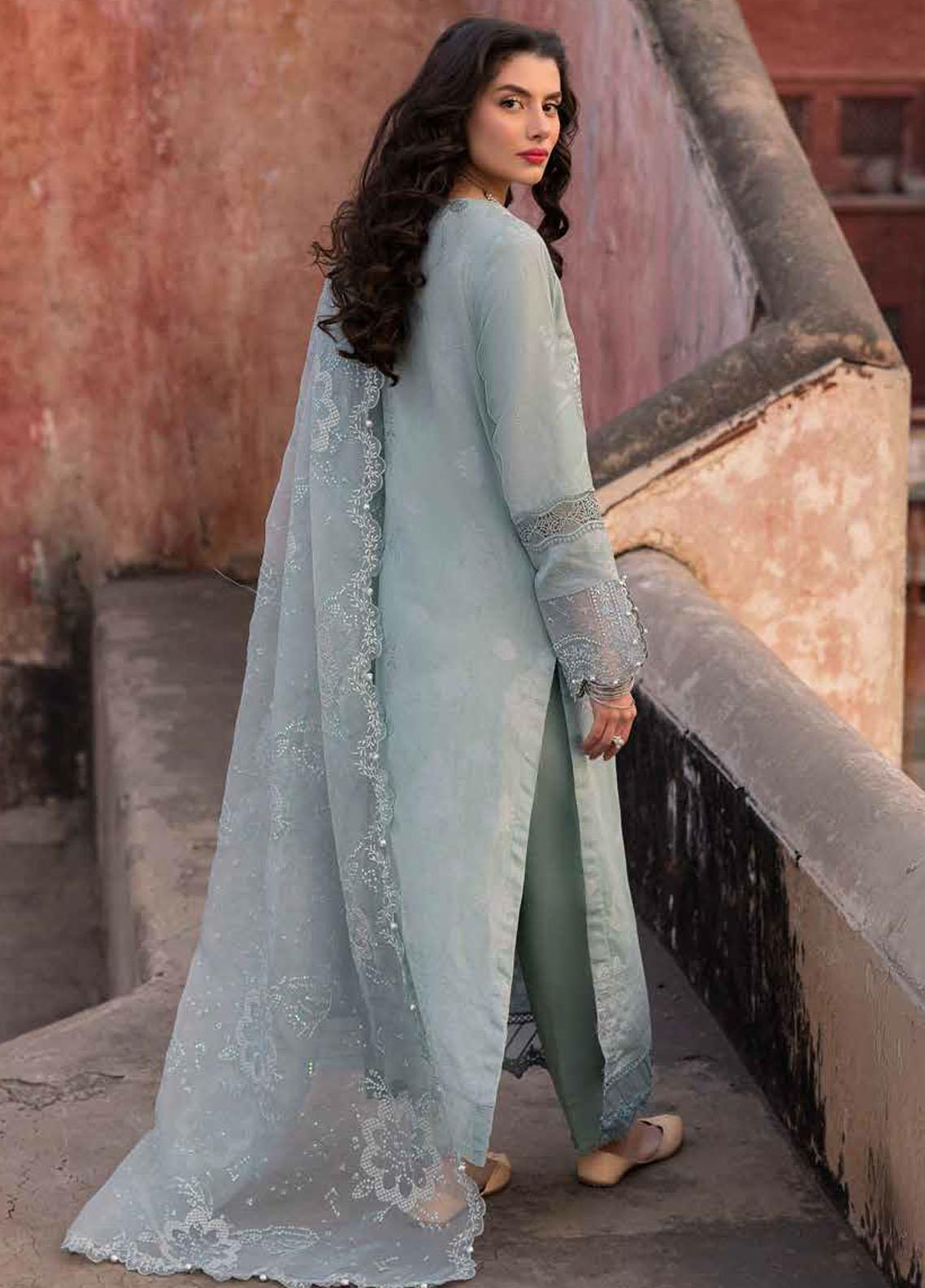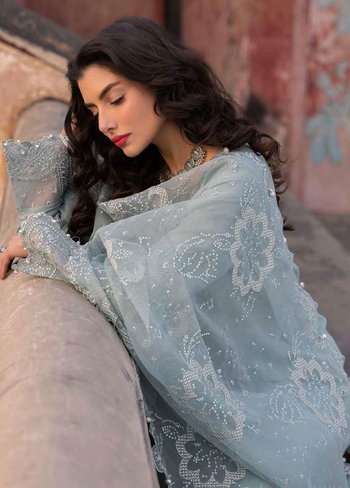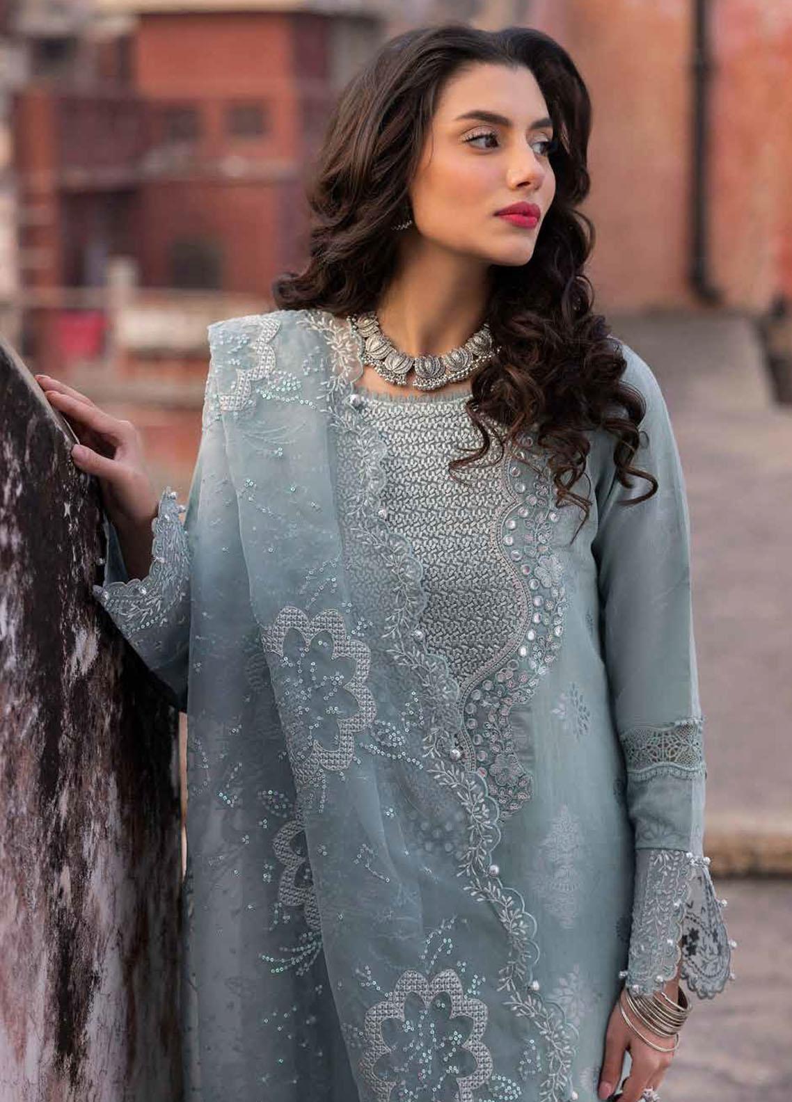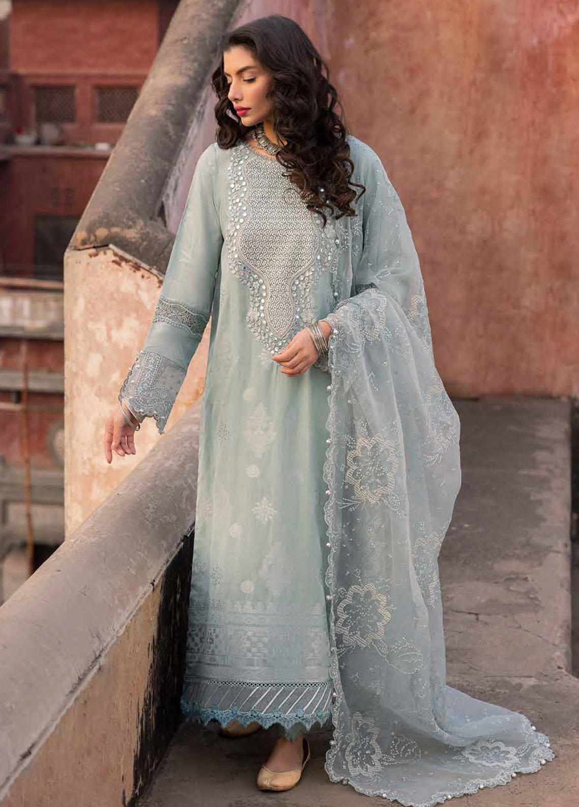 Introducing the Maya By Nureh Unstitched Embroidered Lawn Jacquard 3 Piece Suit - NJ-91. This ladies' blue dress is part of our summer collection and features an exquisite embroidered lawn jacquard shirt and a matching embroidered organza dupatta. The dyed cotton trouser completes the look, making it a perfect addition to your wardrobe.