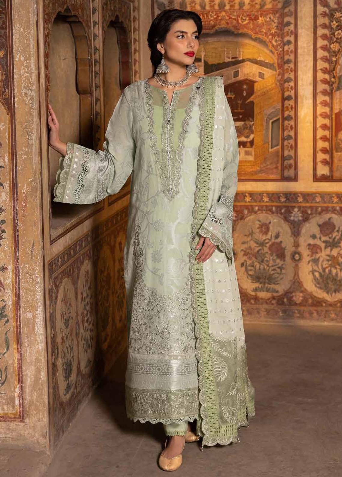 Introducing the Maya By Nureh Unstitched Embroidered Lawn Jacquard 3 Piece Suit - NJ-94. This gorgeous green suit boasts a luxurious jacquard fabric, Embroidered Lawn Jacquard Shirt and Embroidered Zari Chiffon Dupatta. The collection also includes a Dyed Cotton Trouser for complete elegance. Elevate your style with this must-have piece.