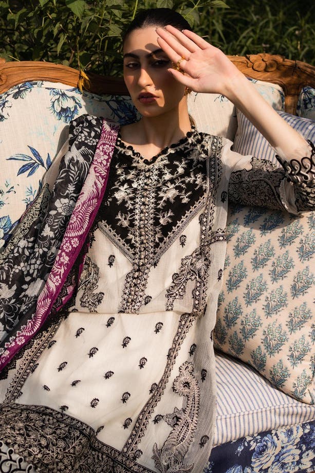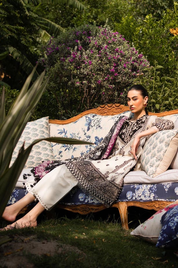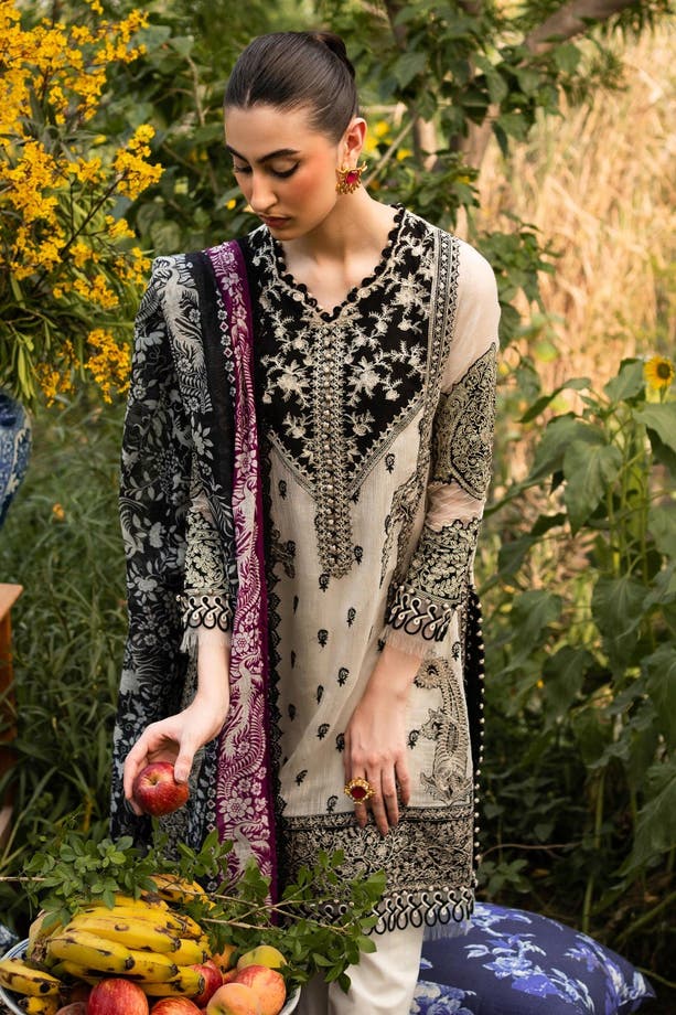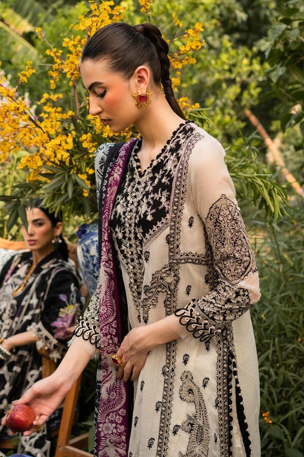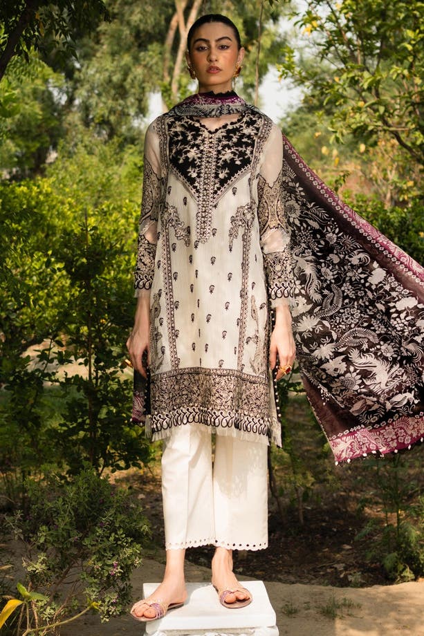 An opulent blend of cultures and craftsmanship, this woven net shirt boasts regal Mughal floral embroidery. Matched with dyed cotton pants and a digitally printed drape that draws inspiration from the serene beauty of Chinese paintings.