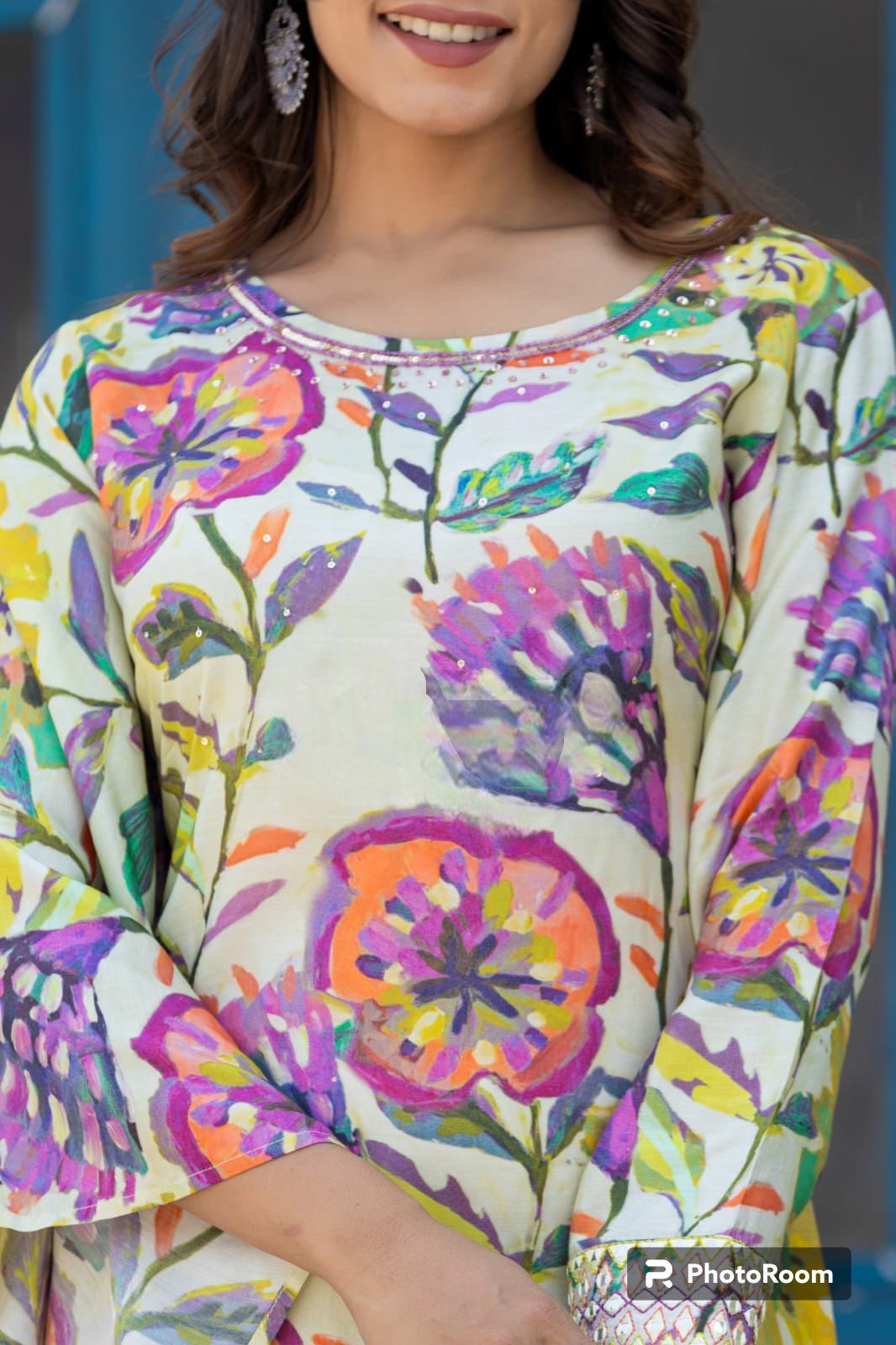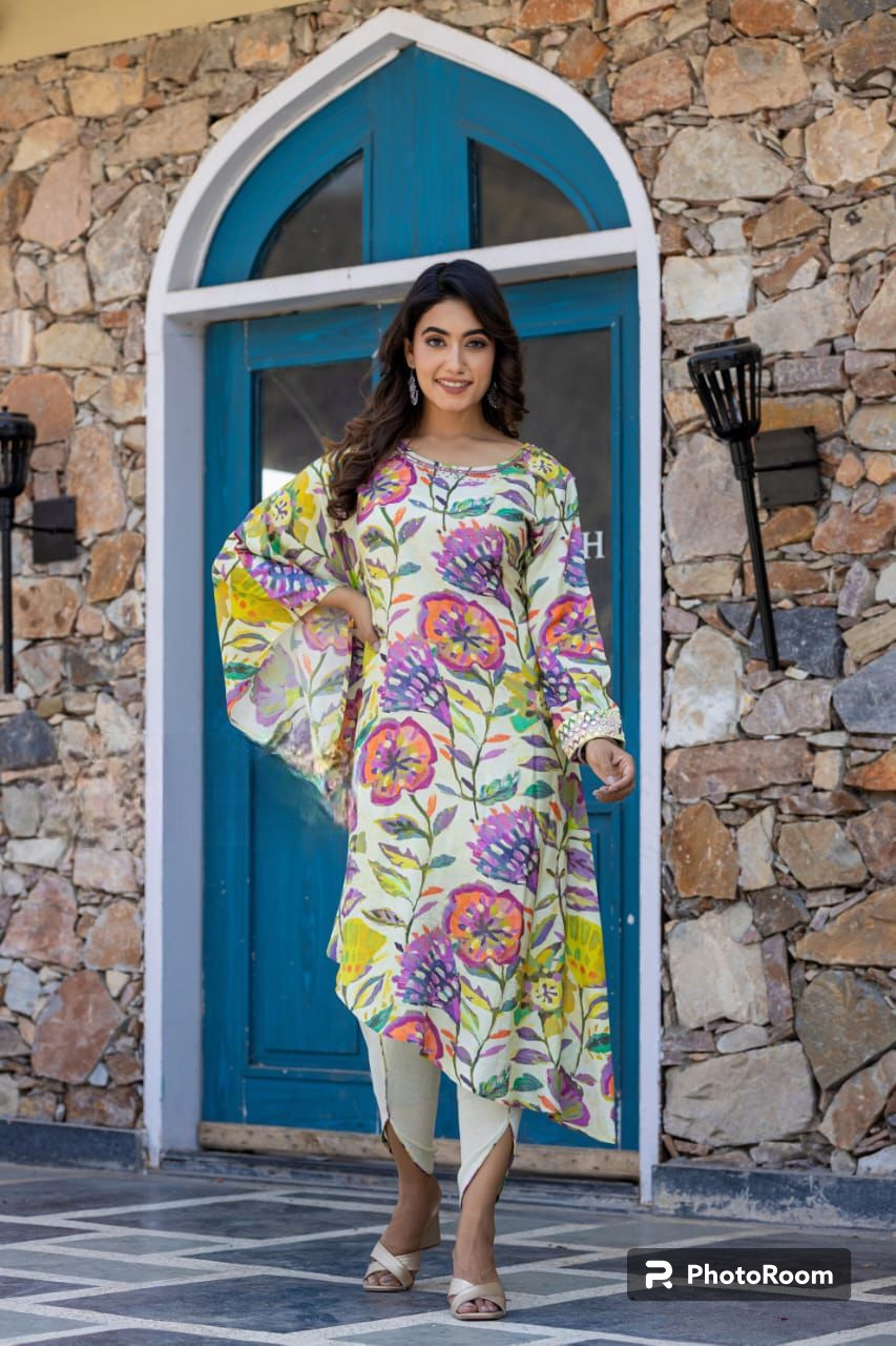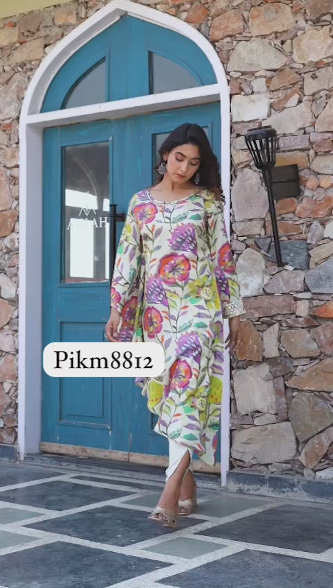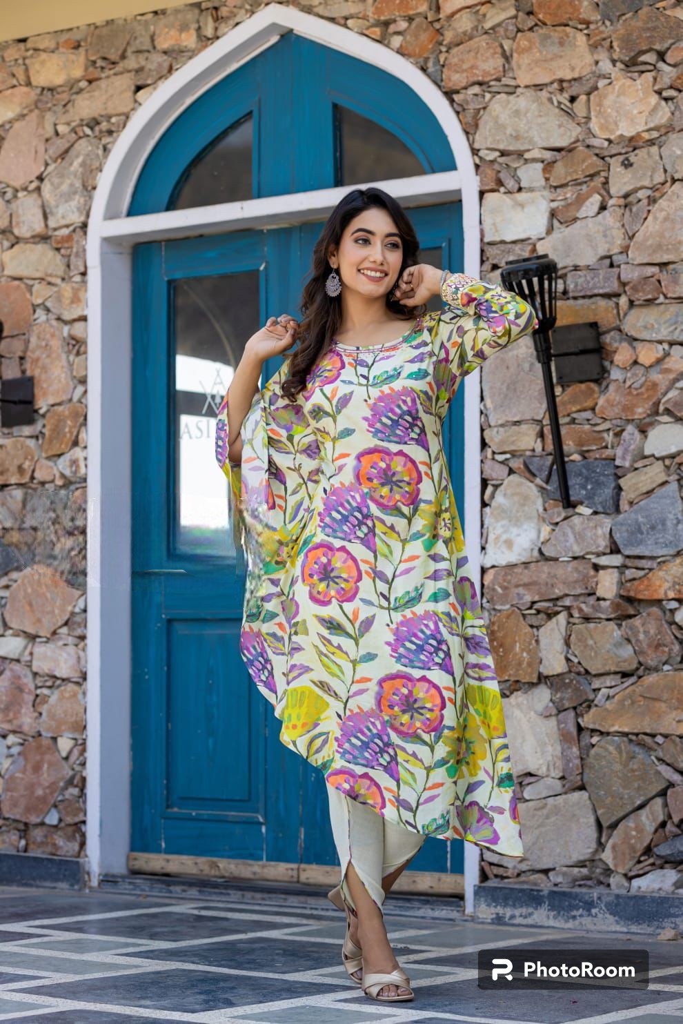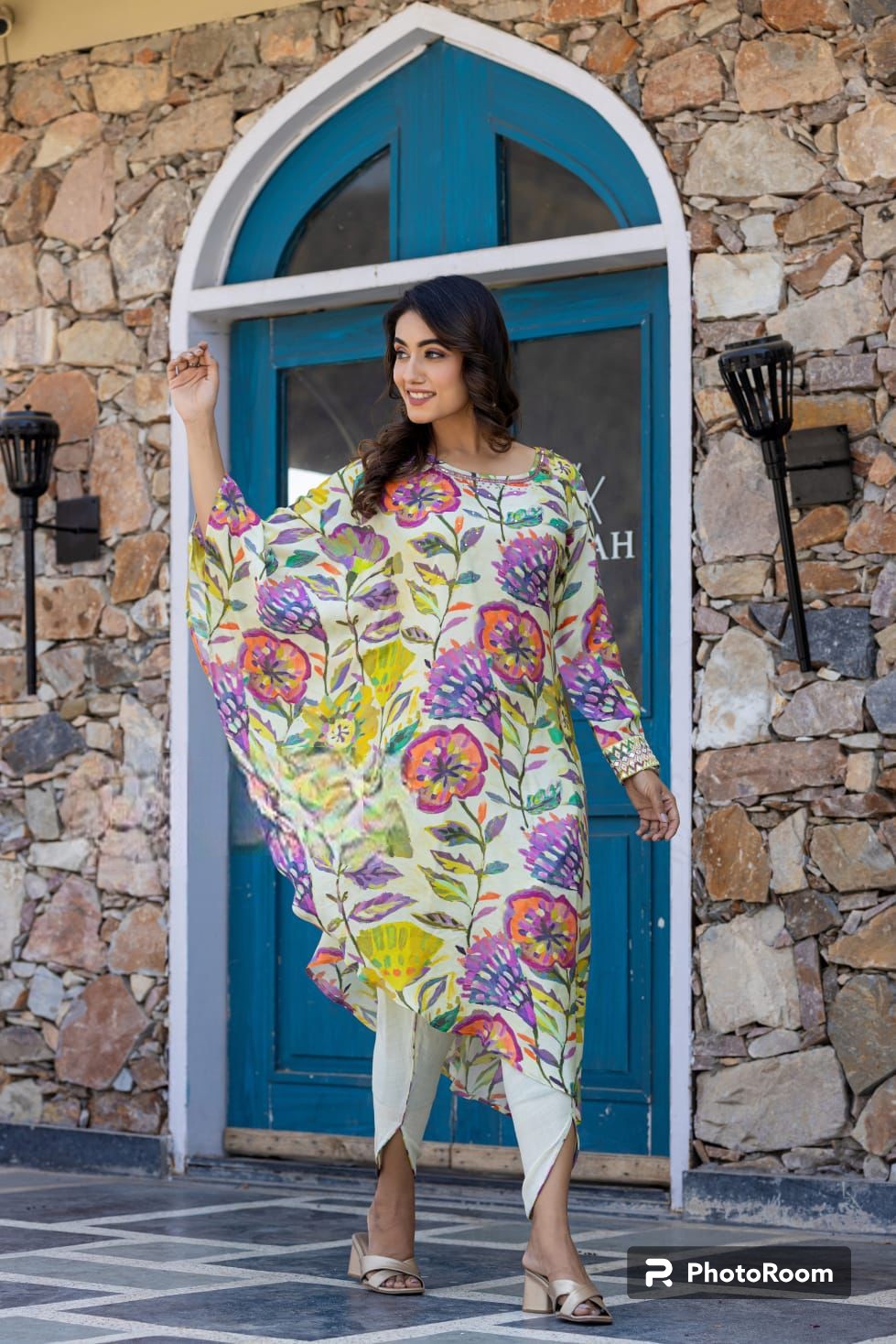 Elevate your wardrobe with the OA Luxe Muslin Kaftan Co-ord Set. This premium ensemble features a stylish one-side kaftan crafted from luxurious muslin fabric, paired with chic cotton tulip pants. The kaftan showcases exquisite foil work on the sleeves and is adorned with an all-over digital print, blending contemporary design with traditional elegance. Perfect for both casual and special occasions, this set offers a harmonious blend of comfort and sophistication. The lightweight muslin fabric ensures a breezy feel, while the tulip pants add a modern touch to the ensemble. Make a statement with this versatile and fashionable co-ord set from OA.