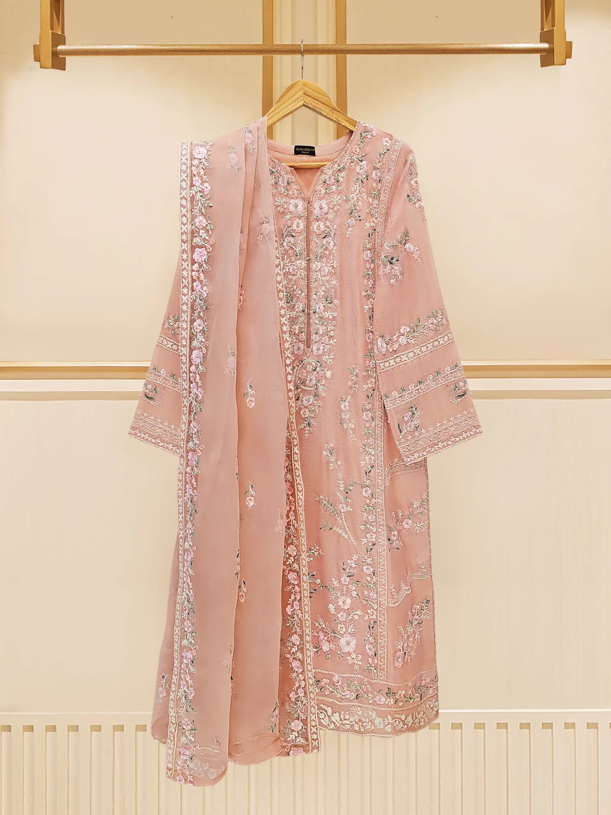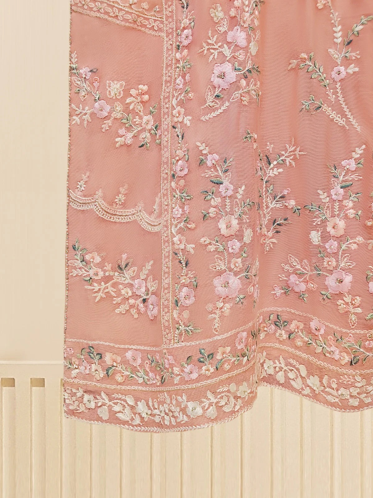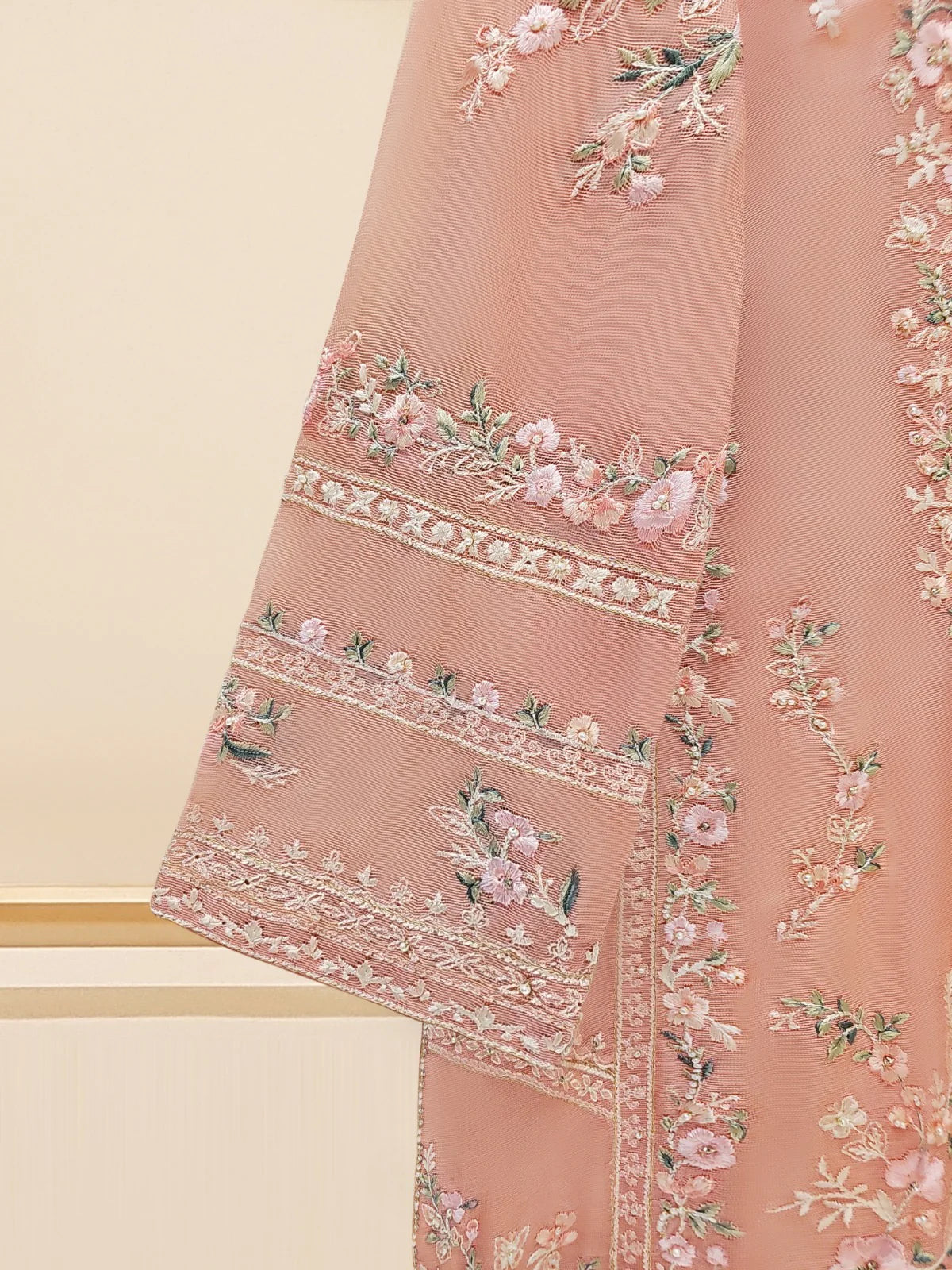Peach Blossom Elegance: Pure Cotton Net Embroidered 3-Piece Suit (S109574)