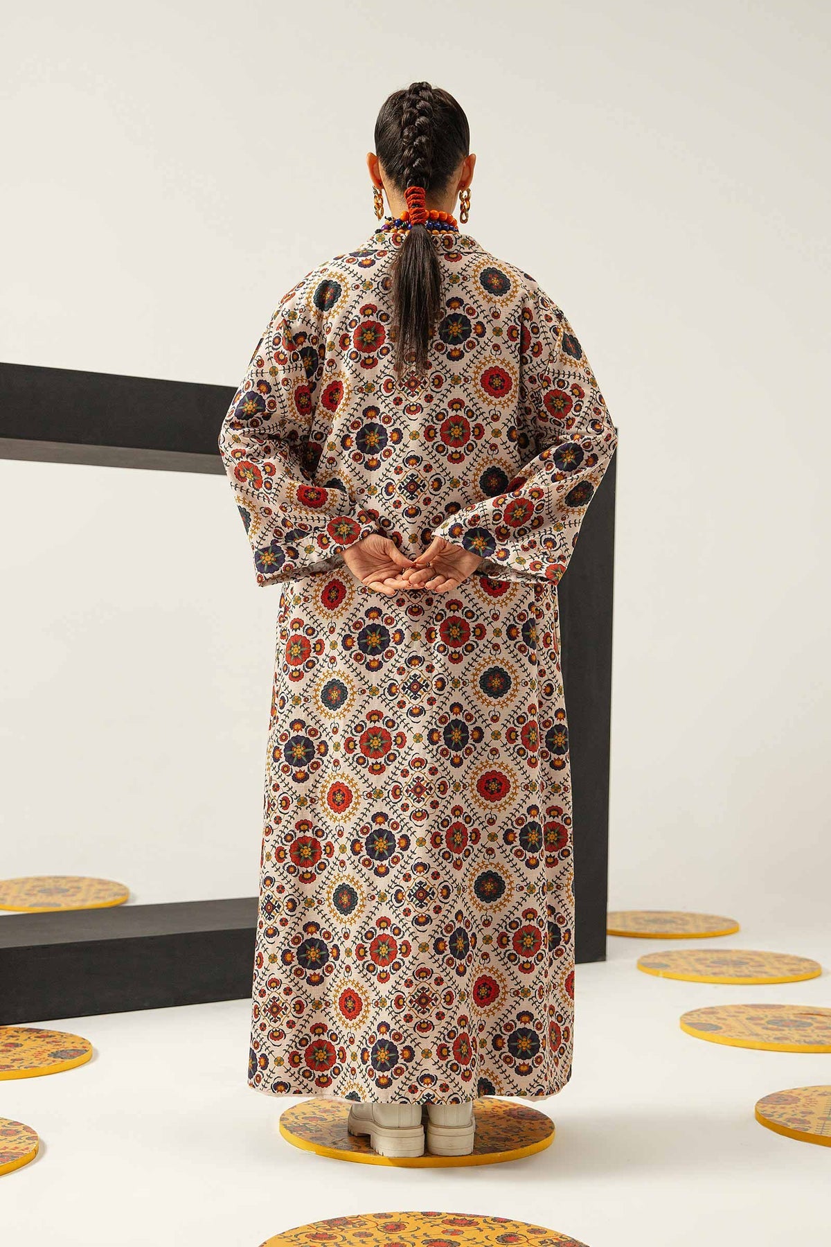 A mesmerizing composition is layered on this subtle coconut milk canvas. It features an efflorescent amalgamation of red rose, blue and yellow that accentuate the perfect khaddar canvas. This playful suzani design perfectly encapsulates the spirit of winters and is one of the favorites in this collection.