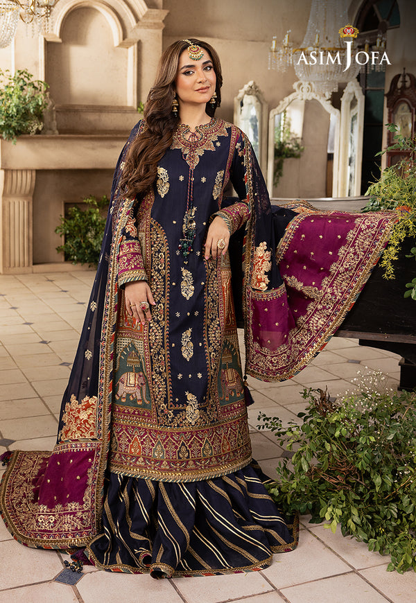 Experience the Midnight Mughal Symphony—a regal ensemble in navy blue and deep magenta that is a true piece of ethnic art. The elephant Mughal motifs adorned with Dori work, antique gold cupped sequins, and zari create a symphony of opulence. The threadwork in shades of blue, deep magenta, rust, moss green, and olive green adorn the neckline, center panels, and embroidered patches reflecting the richness of "Khwab-E-Naubahar." The dupatta is a poetic dance under the midnight sky—a Mughal symphony in the heart of the night.