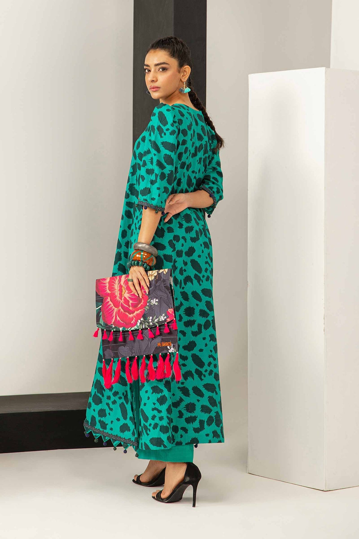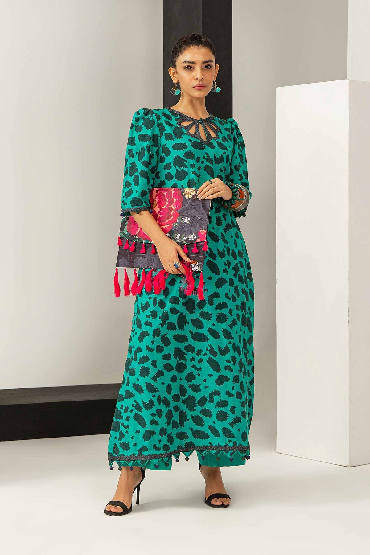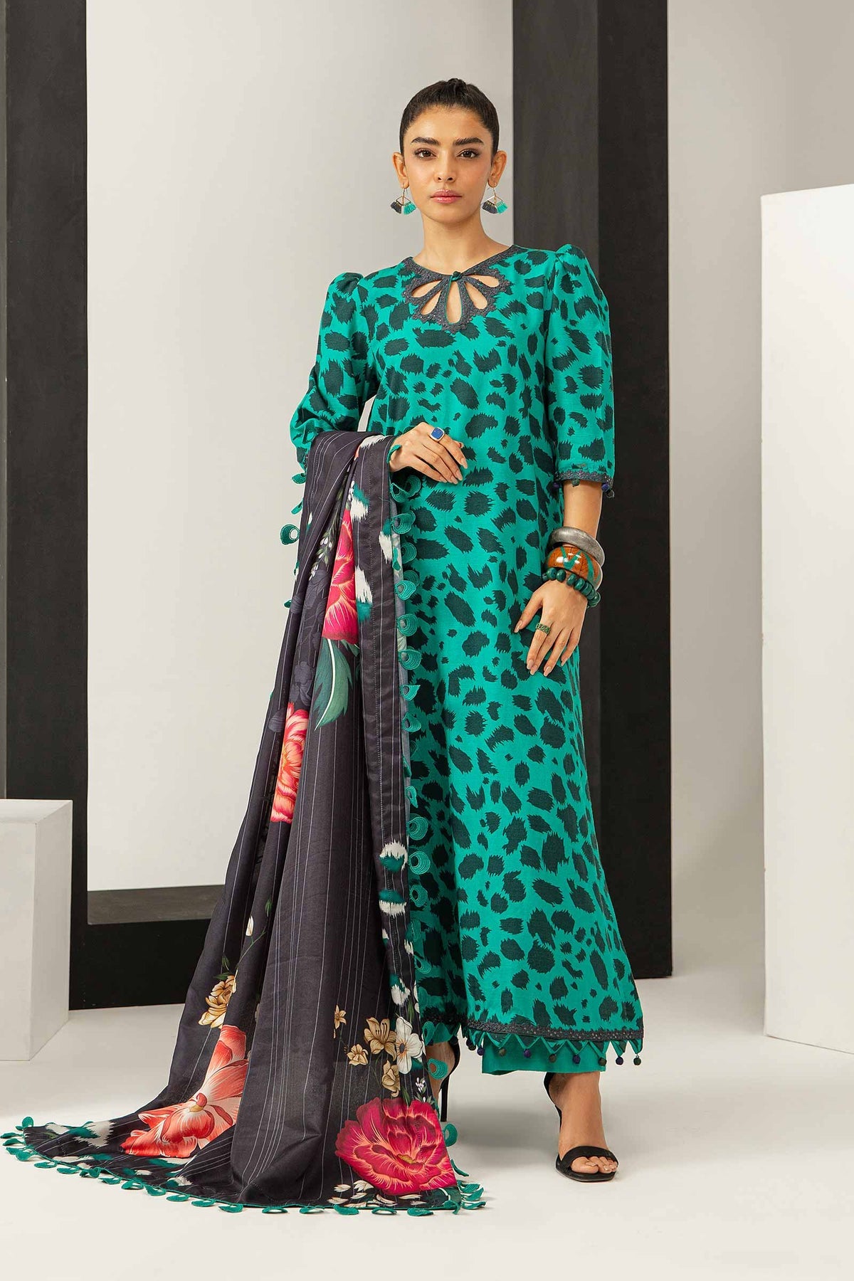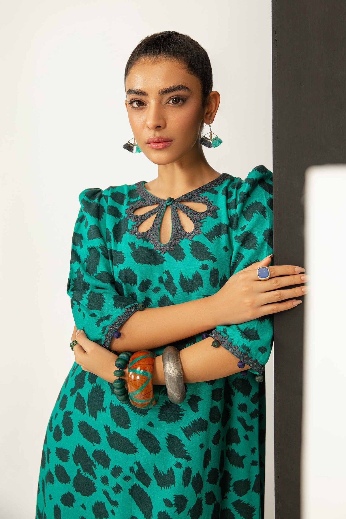 This classically chic ensemble features teal green shade with a cheerful animal print on this 3-piece unstitched design. The graceful outfit features aesthetically appealing embroidery in captivating hues. The dupatta depicts a beautiful bold floral print. Enjoy this chic and comfortable ensemble at formal occasions this winter season.